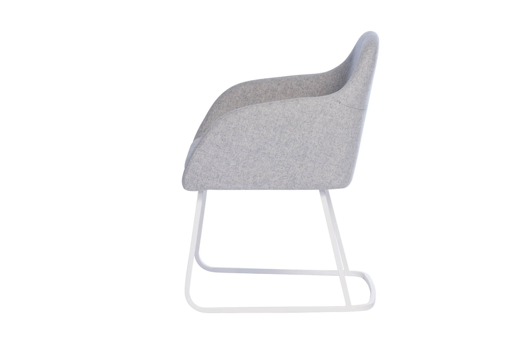 Fauteuil, uit gepoedercoat stalen frame. Zitschaal in beuk fineer bekleed met stof of leer.