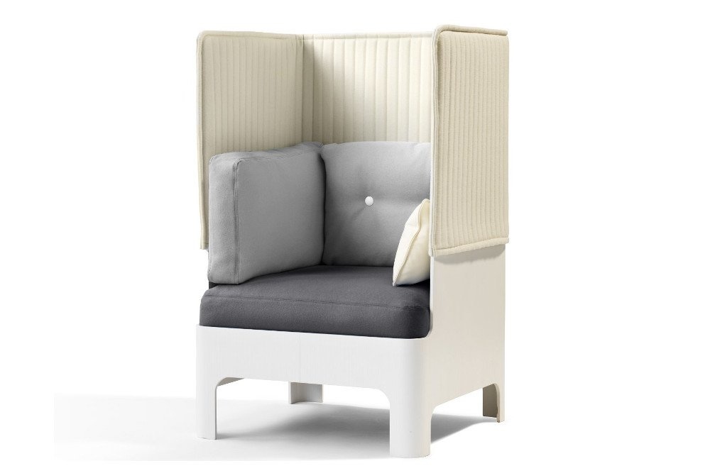 Blå Station Koja fauteuil met een beschermde essenhouten schelp. Met zijn beklede bovenzijde en gevulde kussens is de Koja de perfecte plaats of even te relaxen en je van de buitenwereld af te sluiten. Koja is ideaal voor entrees, lounges, lobbys en bibliotheken, en vele andere locaties. De Koja fauteuil is er in een lage en hoge versie, alsmede als bank. Zithoogte 470 mm, afmetingen 770 x 740 x 830 mm b x d x h, 1210 mm hoog voor de hoge versie. Bekleding in stof of leer. Een bijpassend meubel is de Bla Station Babel salontafel.