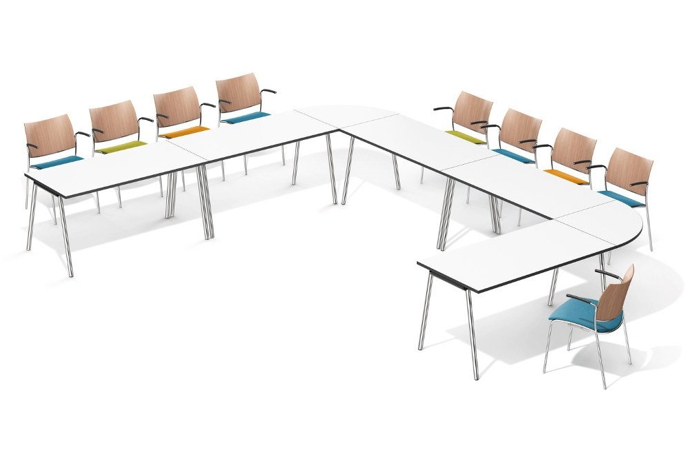 Met deze kenmerken biedt de tafel een uitweg voor ruimtes met variabele inrichtingen zoals kantoorruimtes, vergaderzalen en schoolkantines. Tot slot is de tafel zelf goed te gebruiken om aan te vergaderen of werken.