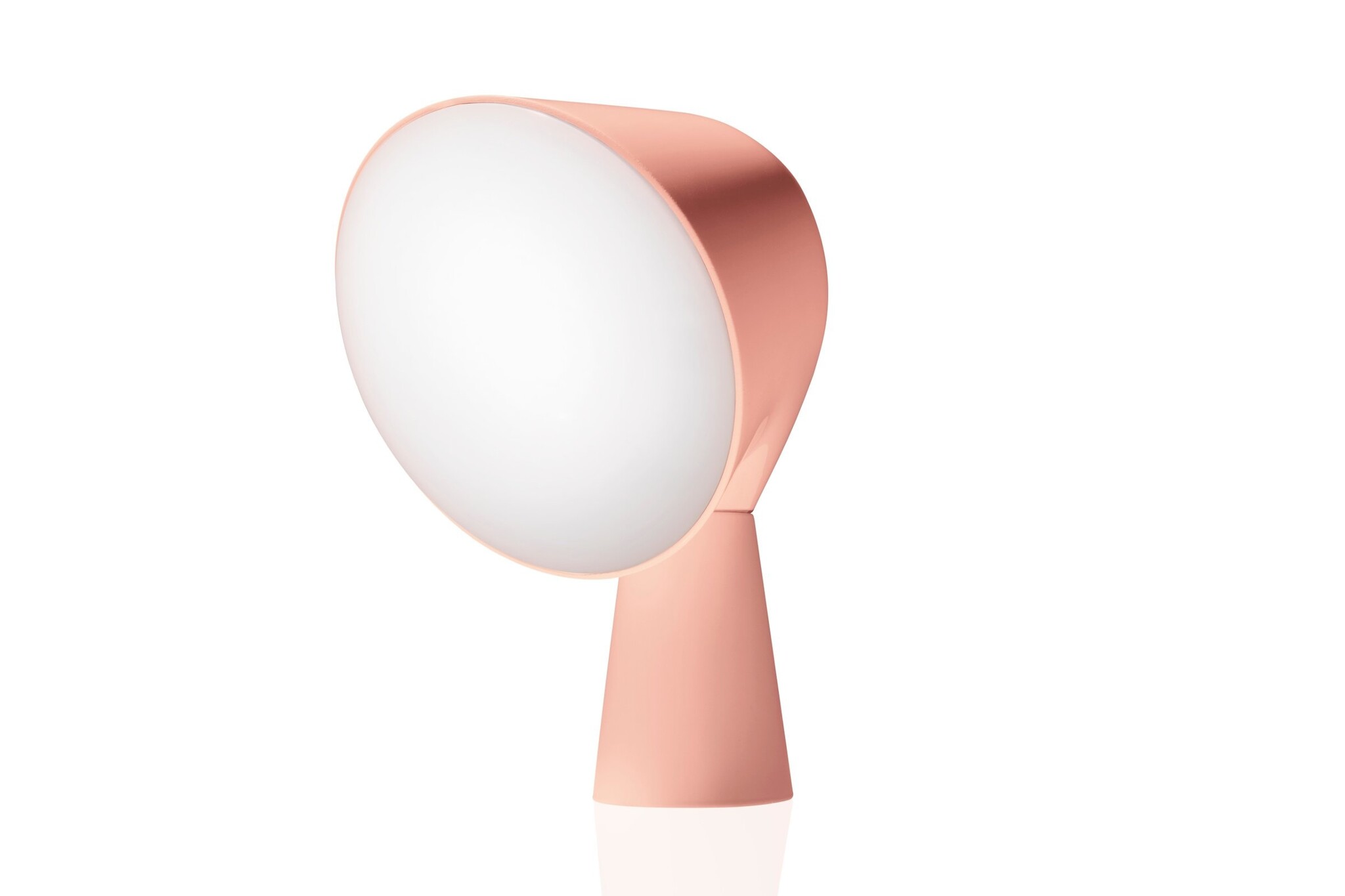 Foscarini Binic een kleine tafellamp. Door de vorm en hoogte is de Binic een karakteristieke lamp. n leggen op persoonlijke spullen. De Binic is leverbaar in zes verschillende kleuren: wit, roze, lichtblauw|aqua, blauw, geel en antraciet. Door de kleine vorm kan de Binic in verschillende ruimtes geplaatst worden van kantoor tot woonkamer.Voor de verlichting zijn moderne materialen zoals polycarbonaat en ABC-kunststoffen gebruikt. De kap heeft een hoogglanzende uitvoering, de sokkel is gematteerd wat zorgt voor een stemmig samenspel.
