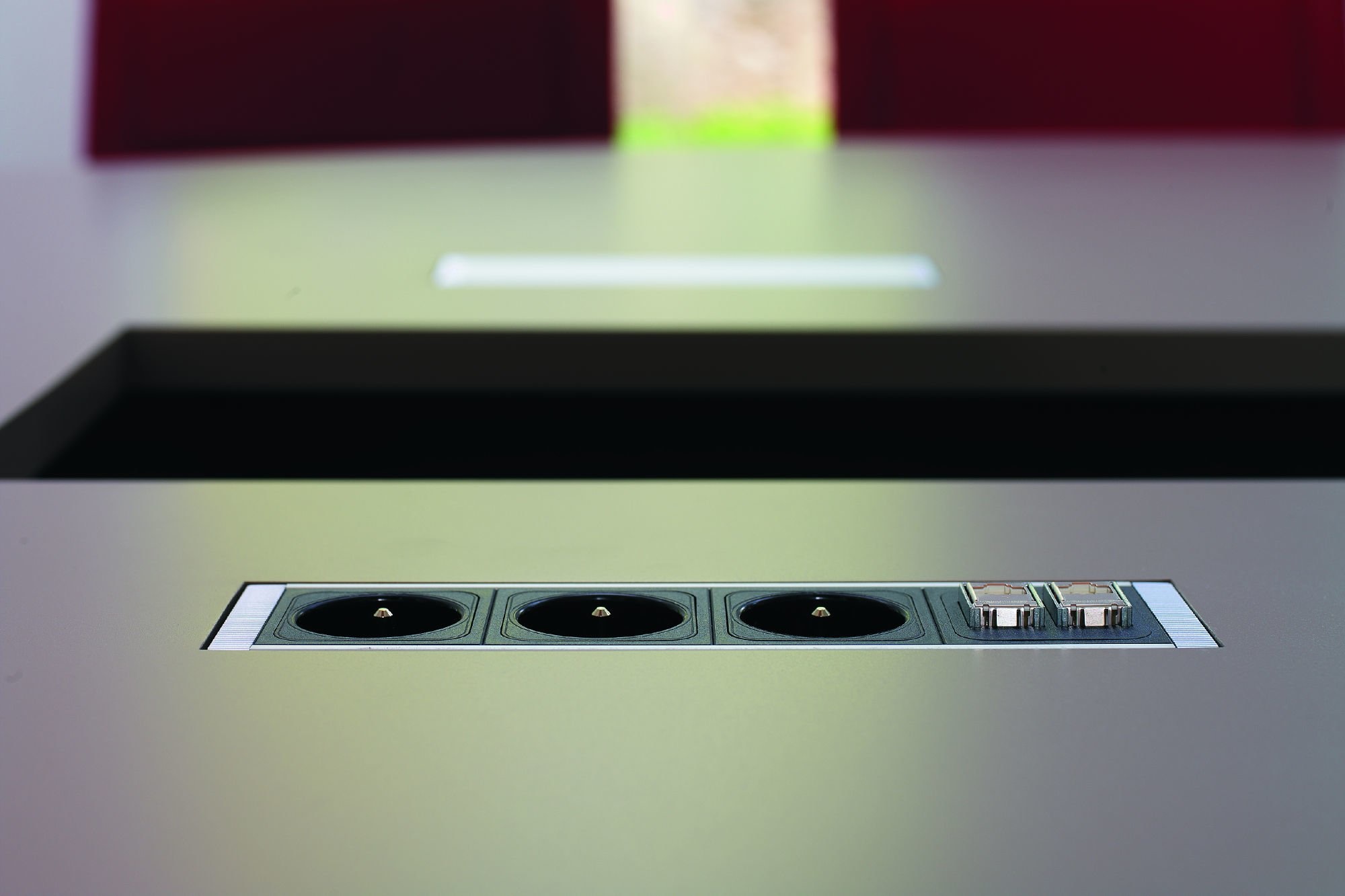 De lessenaar is voor zien van 1x 230volt en 1x data aansluiting met kabelgoot. Het compartiment onder het blad biedt ruimte voor een laptop. Haworth Audience lessenaar kan worden uitgevoerd met een microfoon en verlichting.