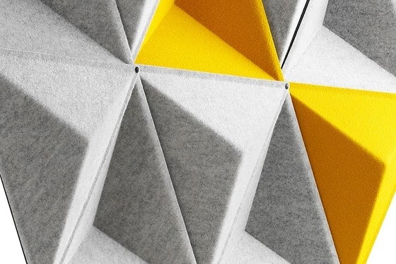 De hoeken verspreiden geluidsgolven gelijk waardoor het product voor een betere geluidsomgeving zorgt. U kunt de Abstracta Aircone opgehangen aan het plafond of tegen de muur op een aluminium rail. Hiermee kunt u in iedere kantoorruimte de juiste akoestische oplossing creëren bij geluidshinder.