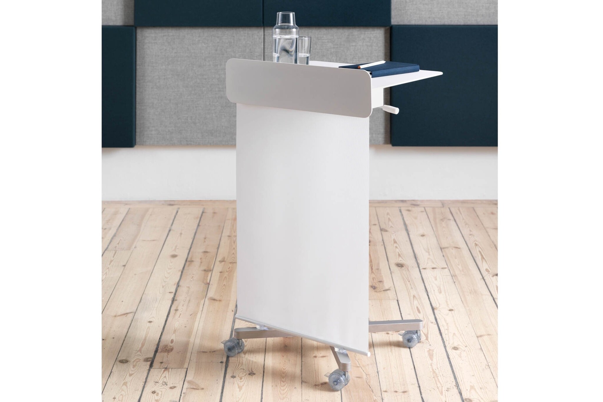 Metalen behuizing 560 x 120 x 75 mm, wit gelakt (RAL 9003). Wit gestreepte stof rolgordijn wordt gebruikt als frontpaneel. Tegen een meerprijs kan een logo worden gedrukt op het rolgordijn. In hoogte verstelbaar door gasveer in de kolom. Verstelbare hoogte: 700-1100 mm.