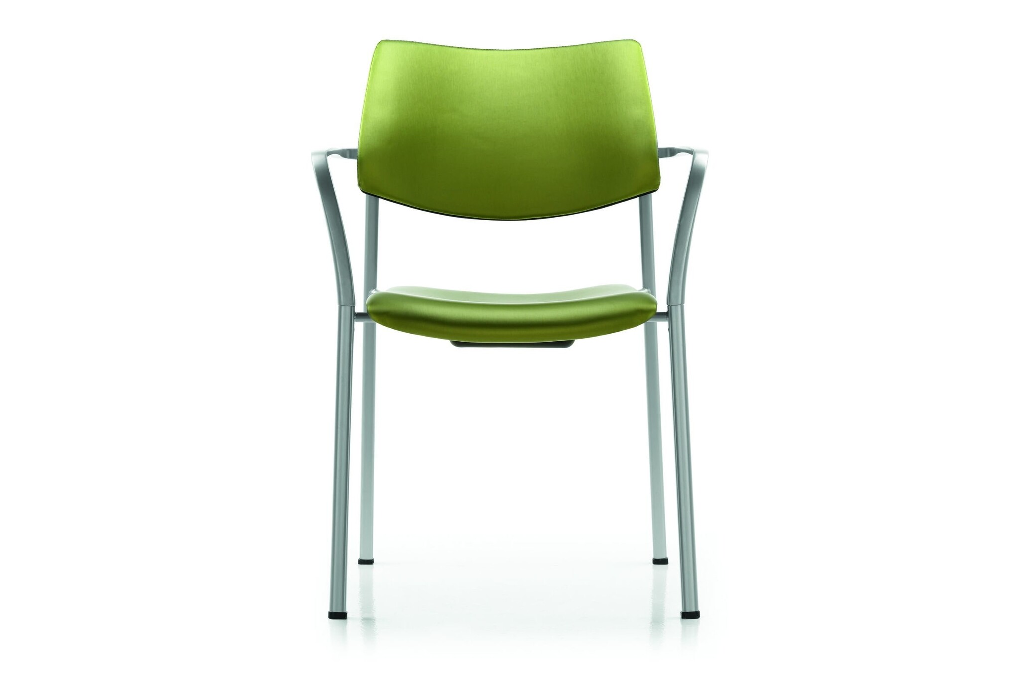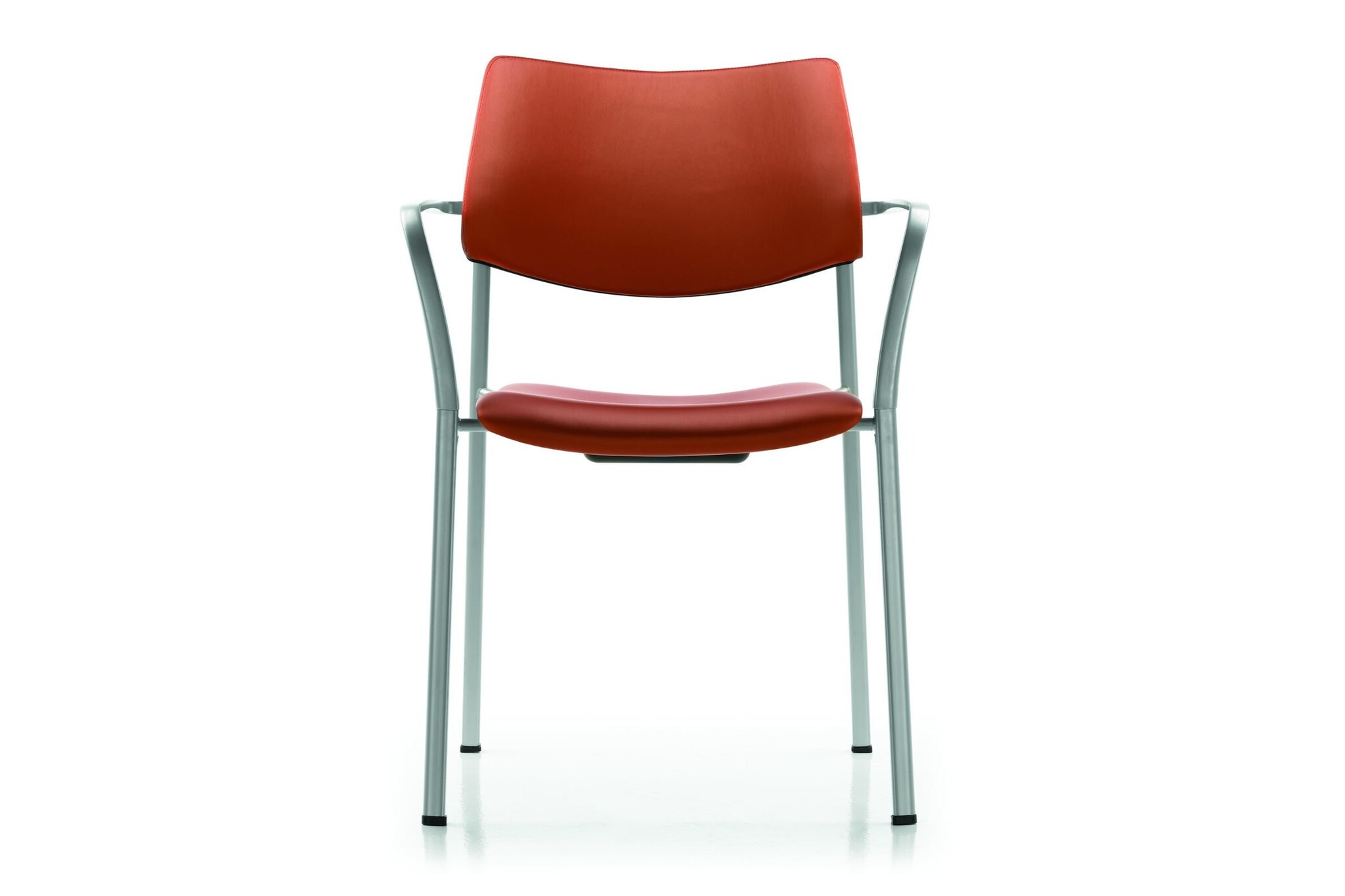 Stapelbare stoel met of zonder armleuningen. Het frame is gemaakt van gepoedercoat staal. Een optie is om deze verchroomd te maken. De zitting en rug is gestoffeerd in stof of zacht leer. De armleuningen zijn gemaakt van polyamide of gepoedercoated aluminium of gepolijst.