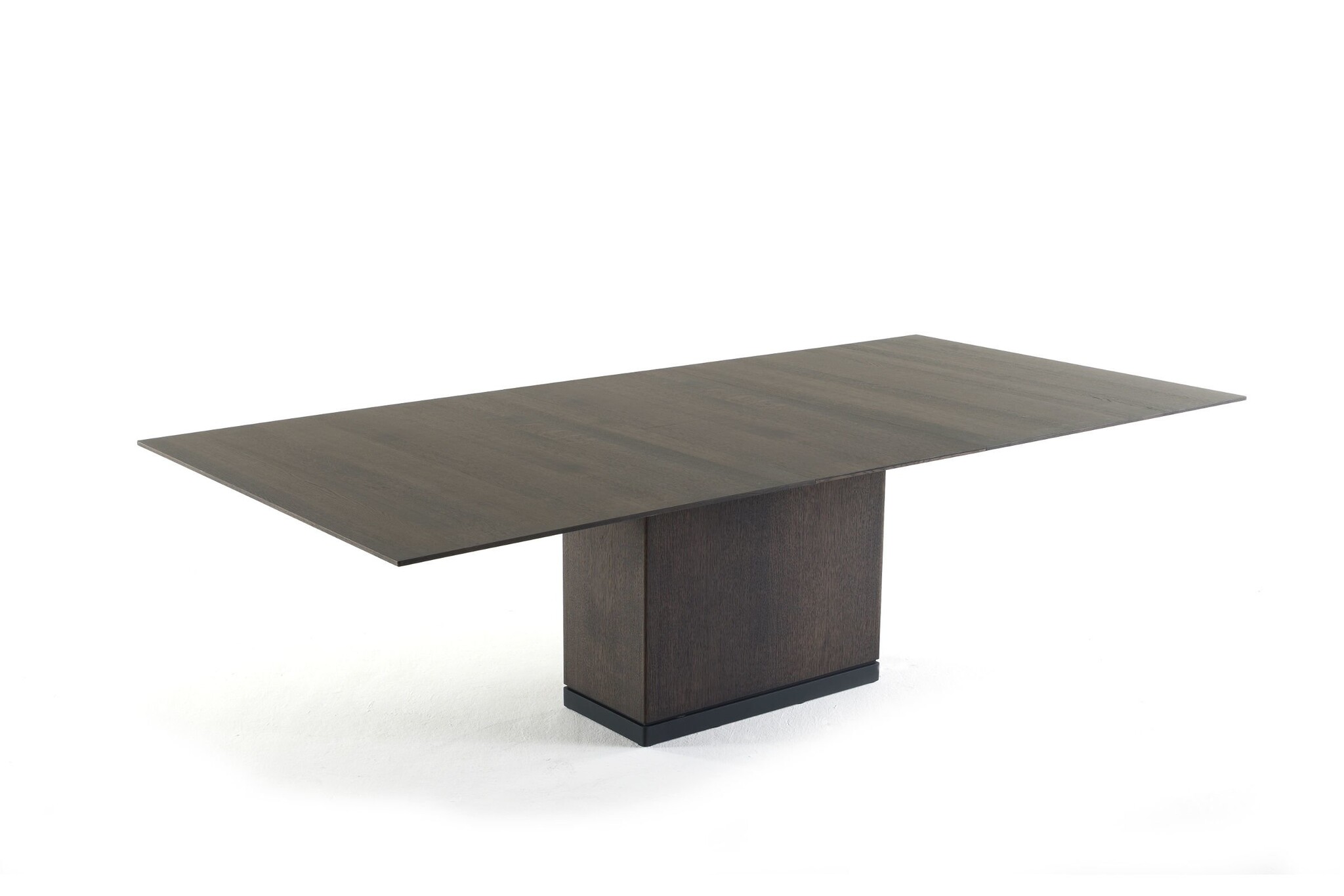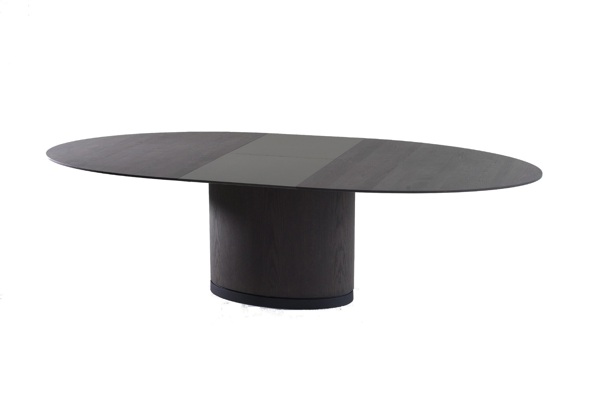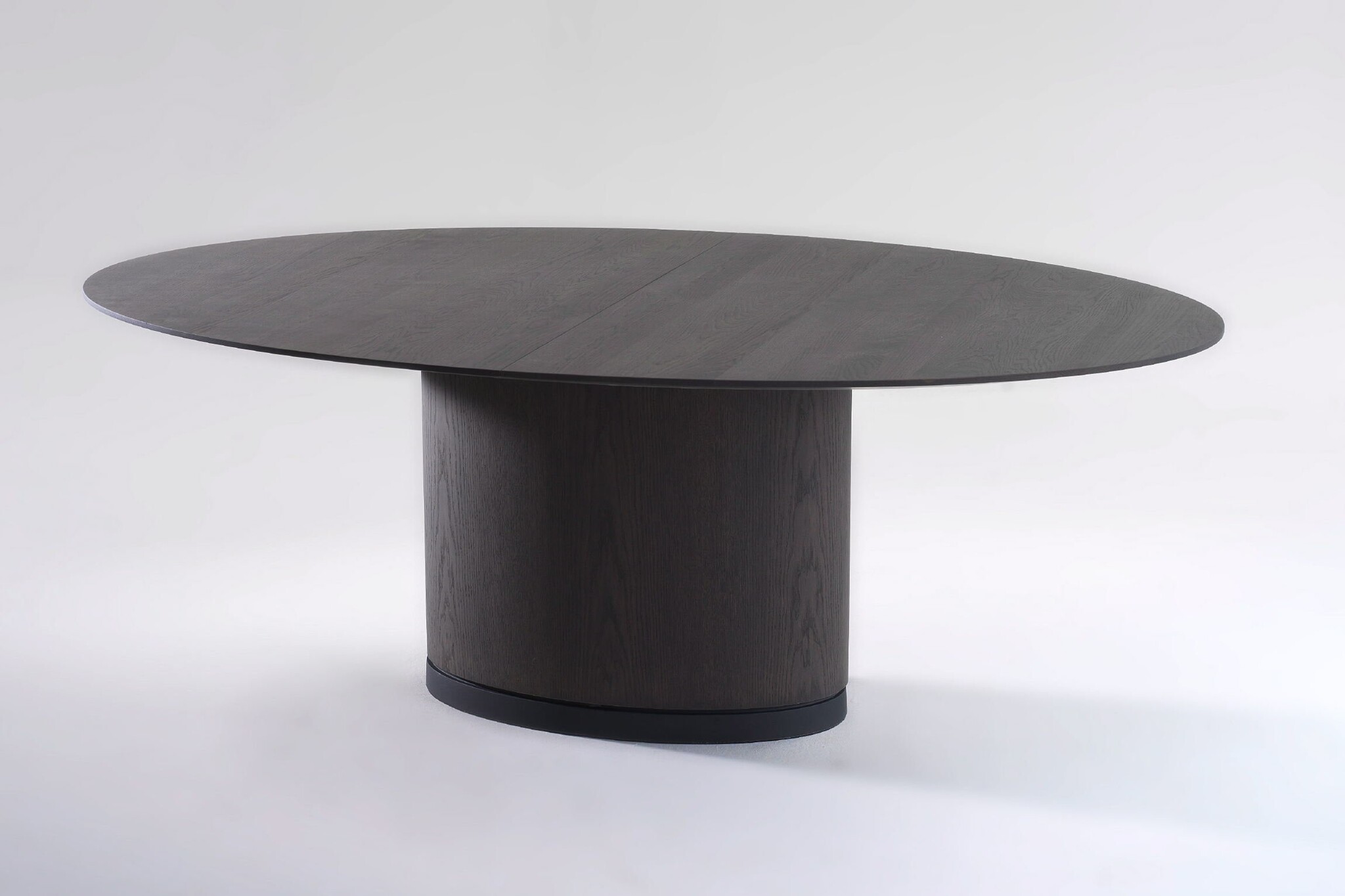 Materialen Arco Spazio tafels: Blad: eiken of noten (massief, fineer), uitschuifblad: eiken of noten (fineer, duramas), kolom: eiken of noten (fineer), kleurlak op mdf en voet: kleurlak op beton.