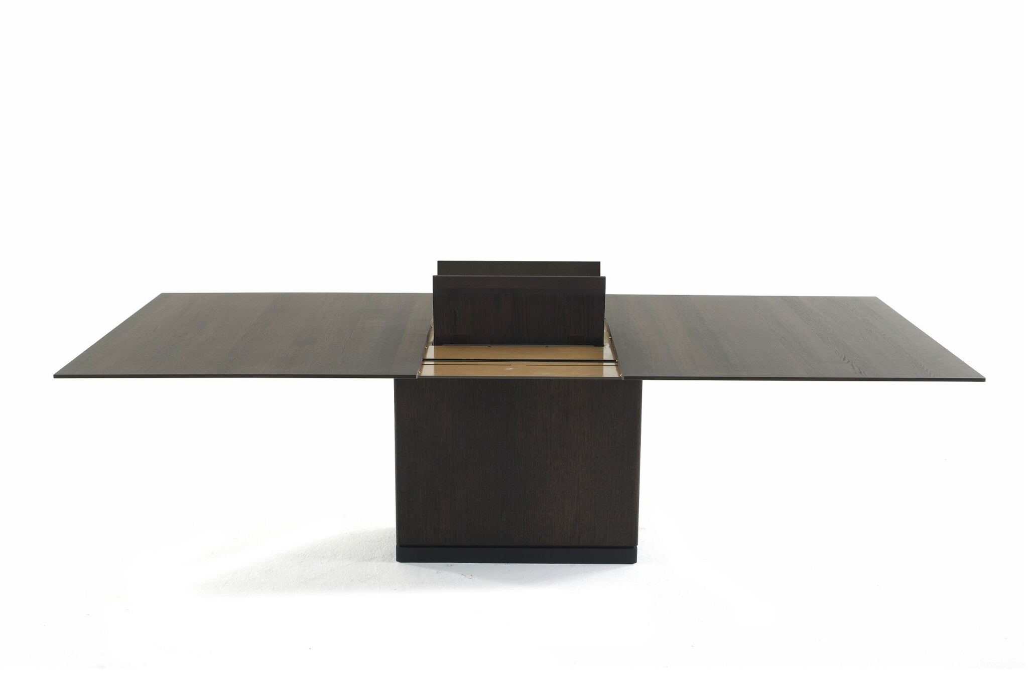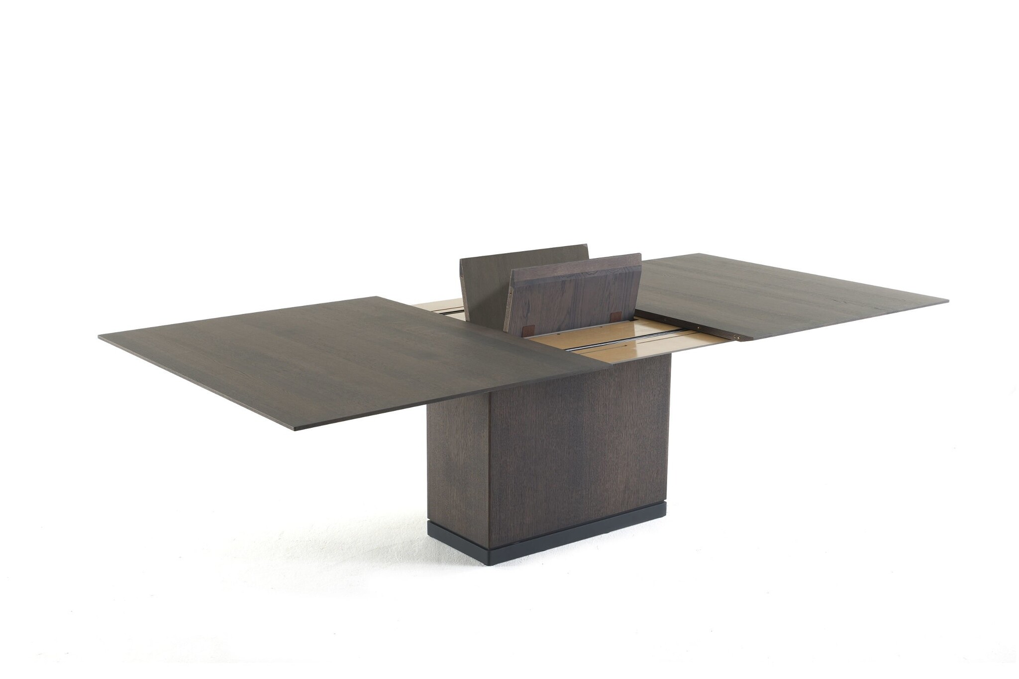 Het inlegblad van de vergrootbare tafel wordt in de kolom opgeborgen en komt via een gasdruksysteem omhoog.