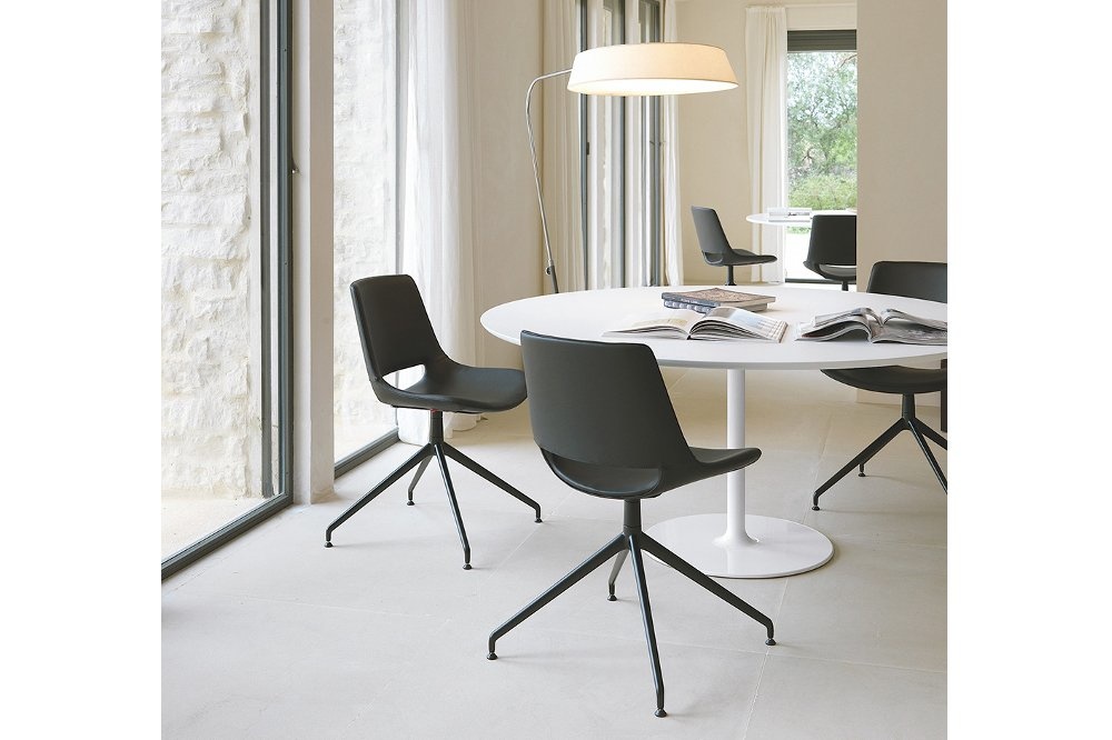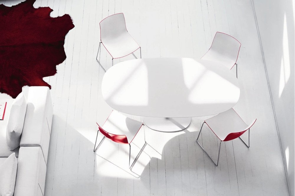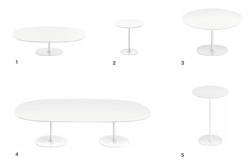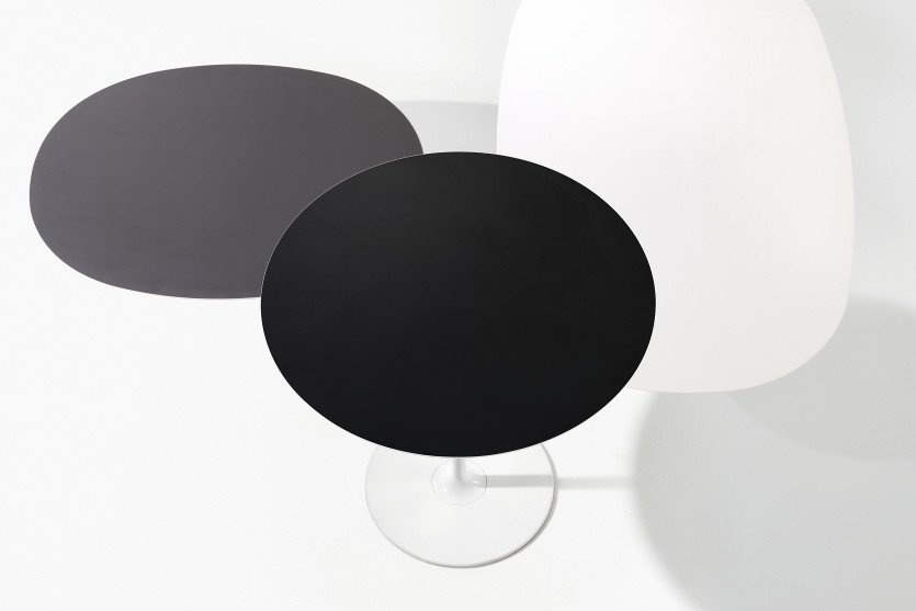 Arper Dizzie tafels met ovaal, rond of vierkant voet in verchroomd of wit gelakt staal. De top is verkrijgbaar in wit reliëf gelakt MDF, in verschillende vormen en maten: ovaal, rond of vierkant. Afmetingen: