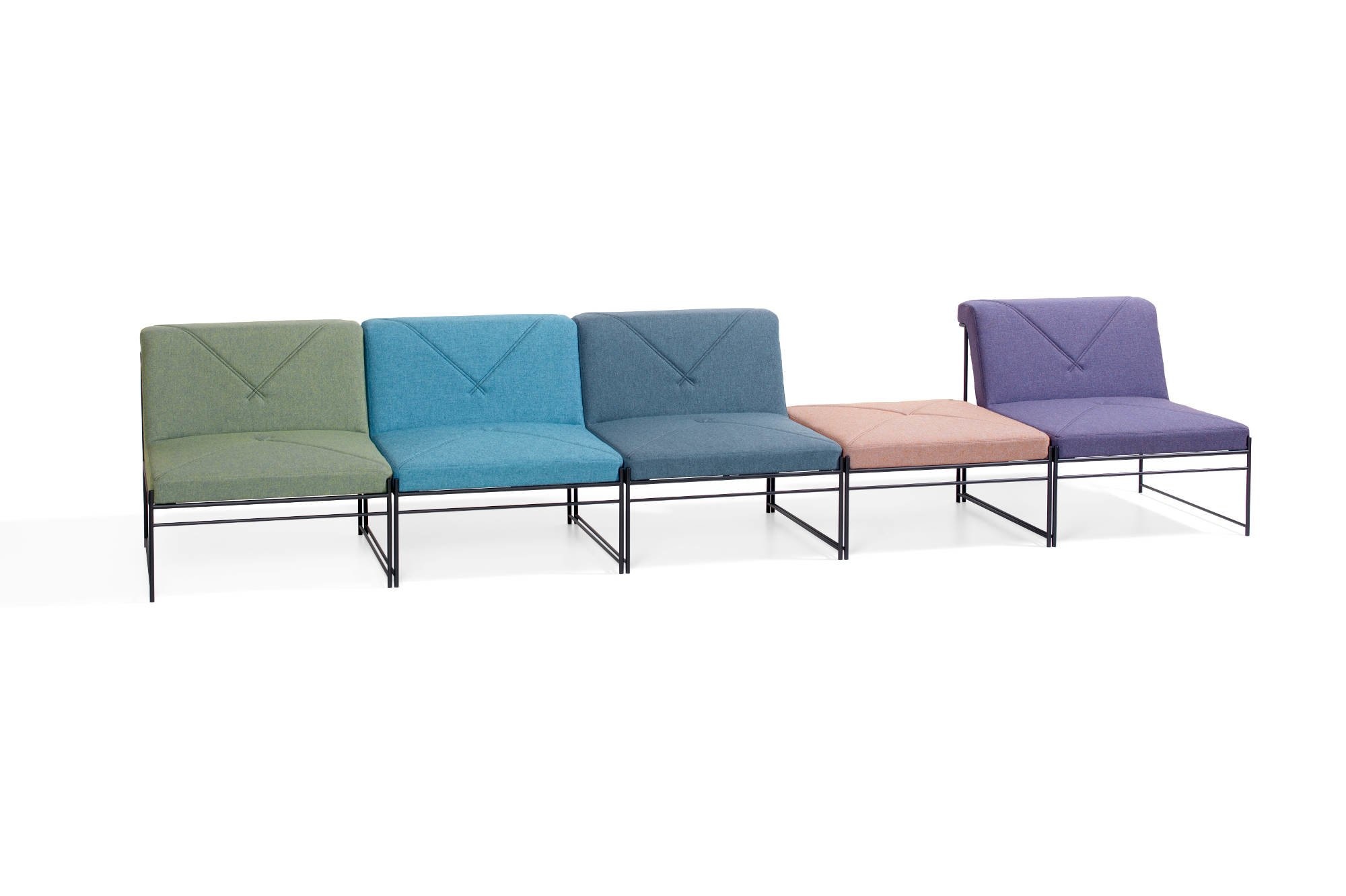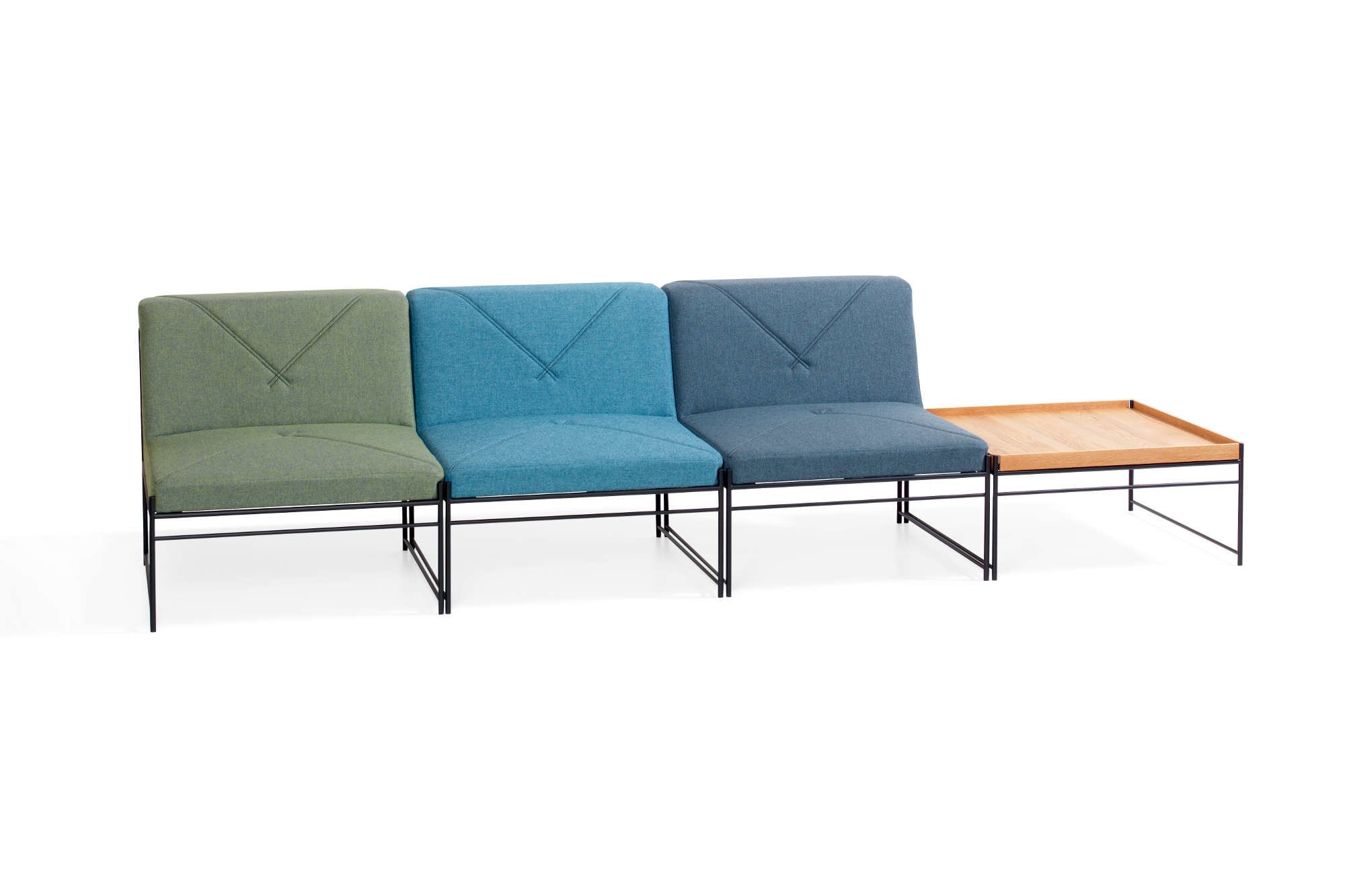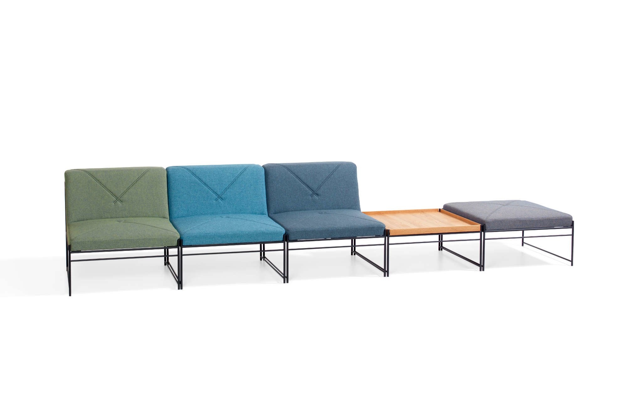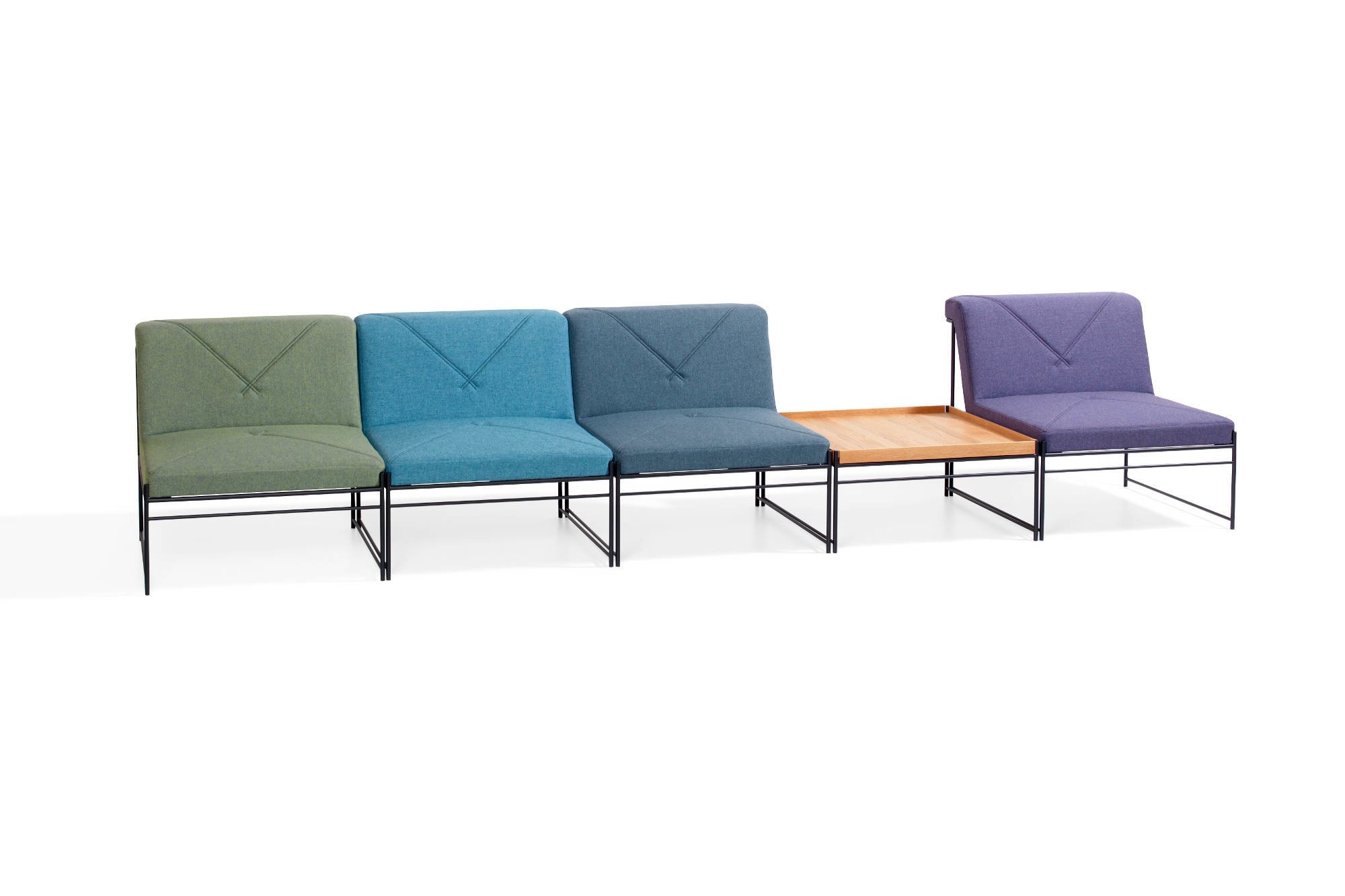 Bla Station Unit koppelbaar modulair zitsysteem en bestaat uit de volgende elementen: een poef, een fauteuil (samen te vormen als bank) en een tafel. Door een frame in horizontale en verticale lijnen lijkt het alsof het zweeft boven de vloer. Ontwerp Tomoyuki Matsuoka Kenmerken Blå Station Unit bank