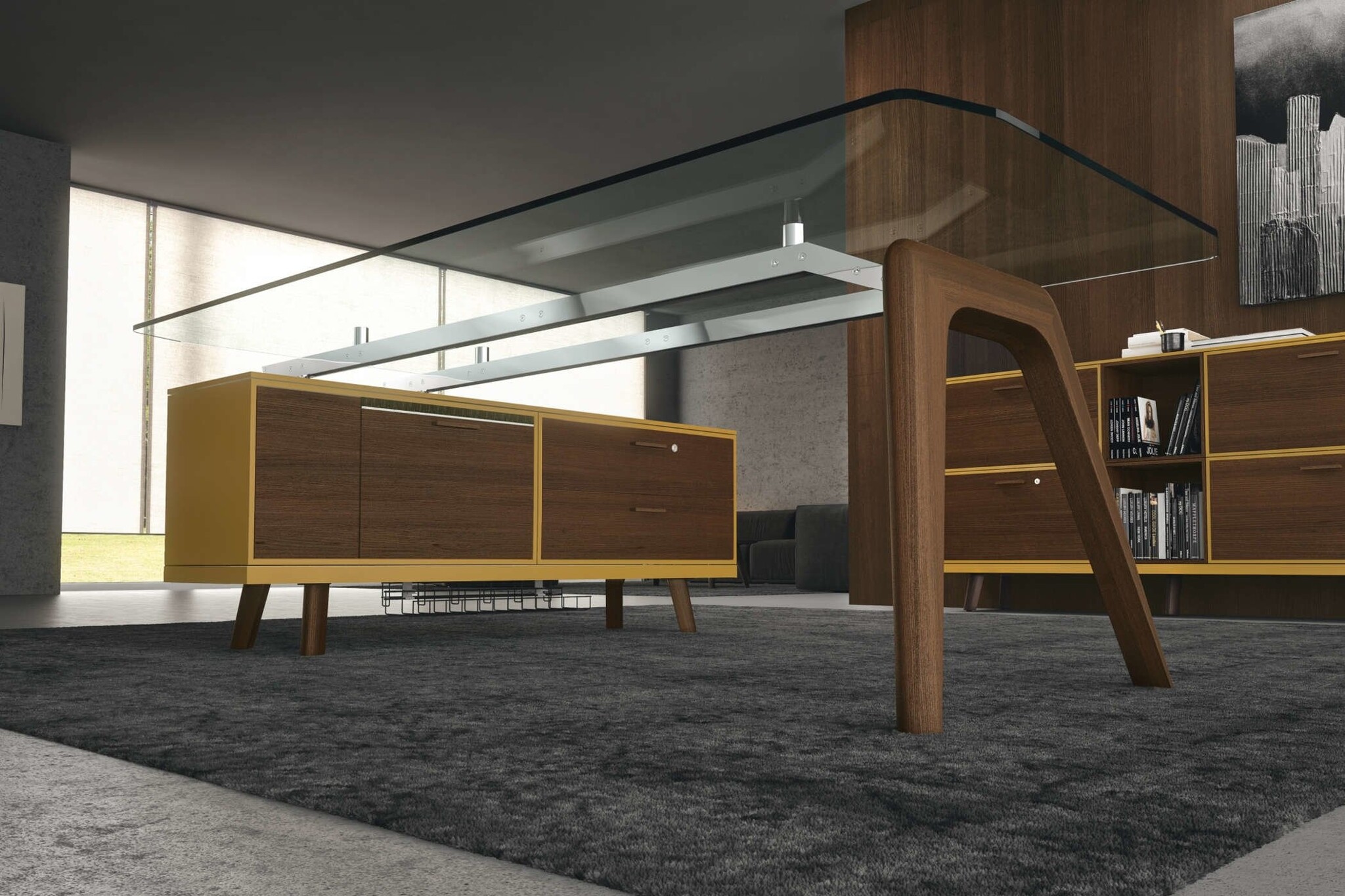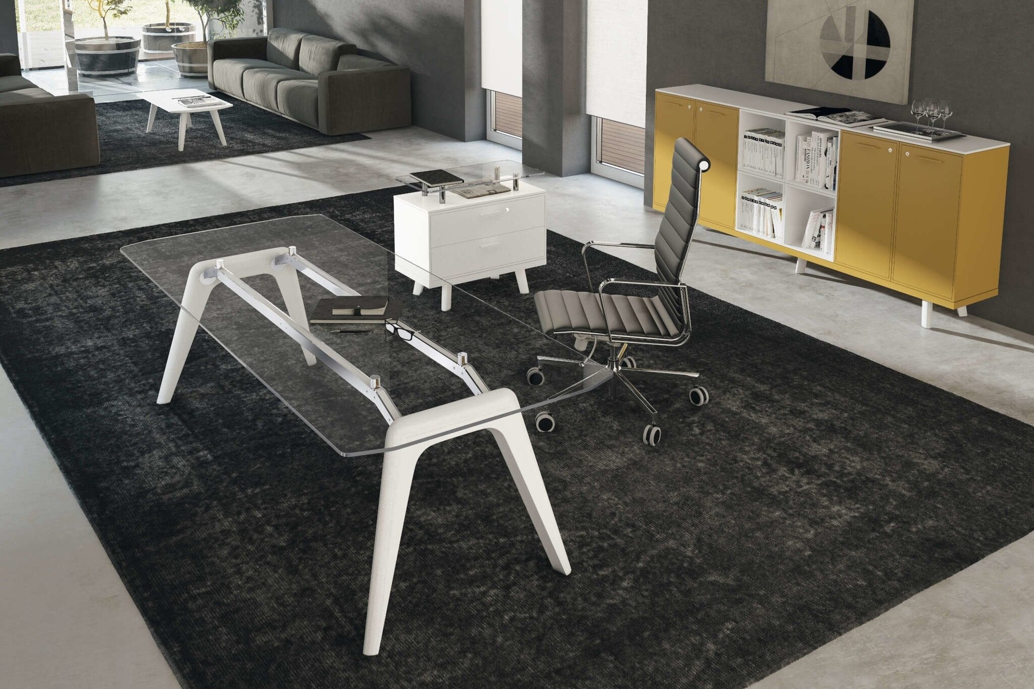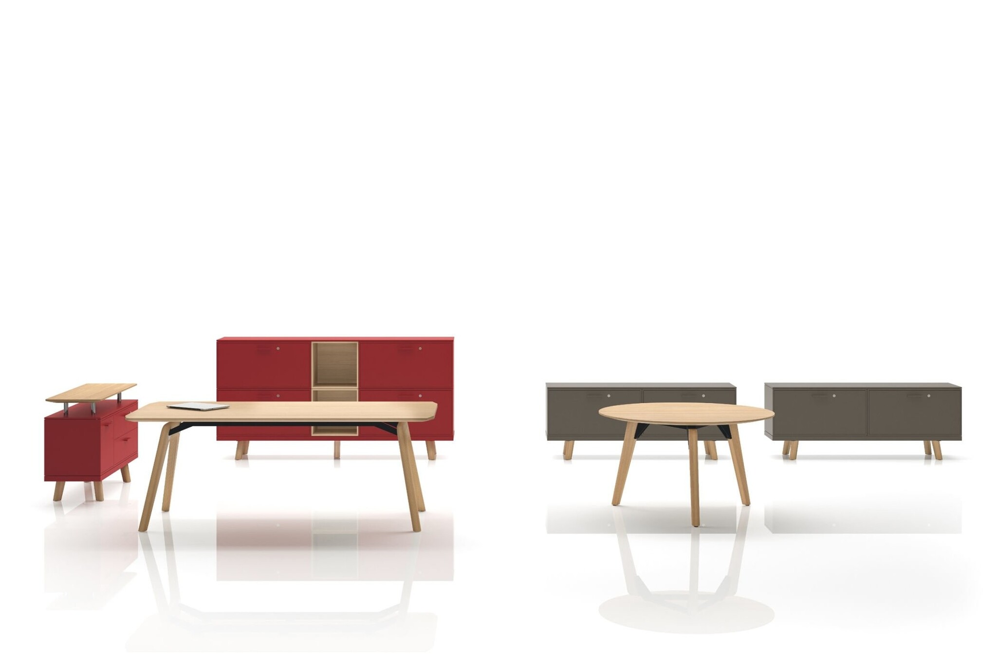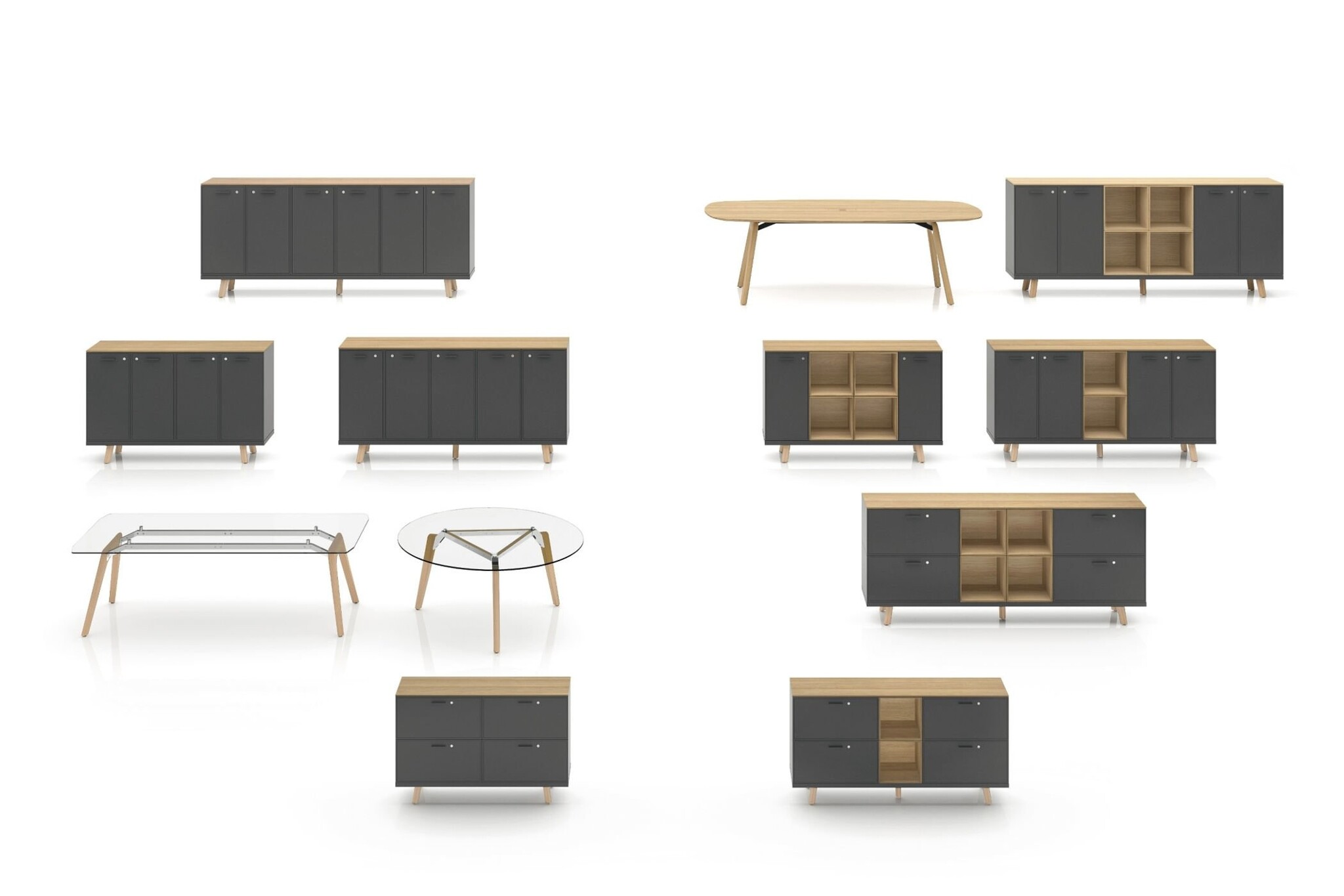 De Bralco Rail is een compleet werkplekprogramma, bestaande uit bureaus, vergadertafels en kasten. De stijlvolle uitgevoerde kantoormeubelen zijn leverbaar in verschillende afmetingen en met verschillende afwerkingen. Elektrificatie in de bladen De bladen van de Bralco Rail vergadertafels kunnen uitgerust worden voor het aanbrengen van ingewerkte stekkerhouders met klep in de lengte aan beide kanten van de tafel, uitgerust met een kabeluitgang. De klep is afgewerkt met hetzelfde houtfineer en in dezelfde kleur als het blad van de Bralco Rail. Glazen tafels De bladen van schrijf- en vergadertafels – van de Bralco Rail zijn in getemperd transparant glas van 12 mm leverbaar. De glazen bladen zijn vastgemaakt aan de metalen en gechromeerde balken met behulp van cilindervormige metalen afstandsstukken van 32 x 35 mm hoogte. Er is een optionele gechromeerde kabeldoorvoerdop met een doorsnede van 80 mm beschikbaar. Bij de Bralco Rail vergadertafels worden de kabels door een gechromeerde kabeldoorvoerdop naar het blad gebracht. Bralco Rail poten De poten van Bralco Rail schrijf- en vergadertafels zijn leverbaar in gerond gepolijst hout en gelakt met verf op waterbasis met open porie. Drie poten met een dikte van 53 mm, voor een totale afmeting van 800 mm en een hoogte van 690 mm. Aan de onderkant bevindt zich een regelbaar pootje van 6 mm. In de twee cirkelvormige ruimten in de poot worden gechromeerde metalen staven gemonteerd voor de verbinding met de balken. Materialen