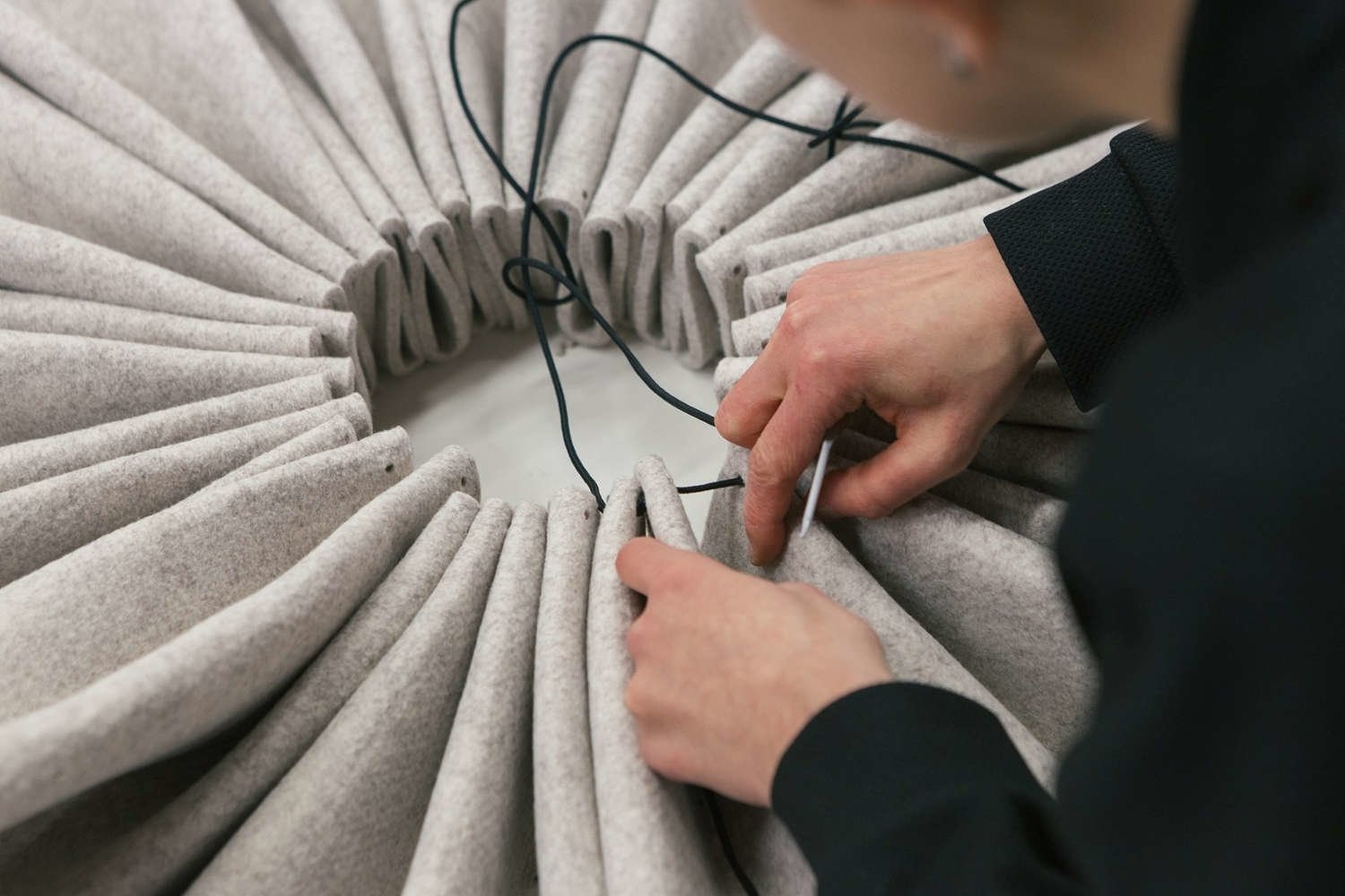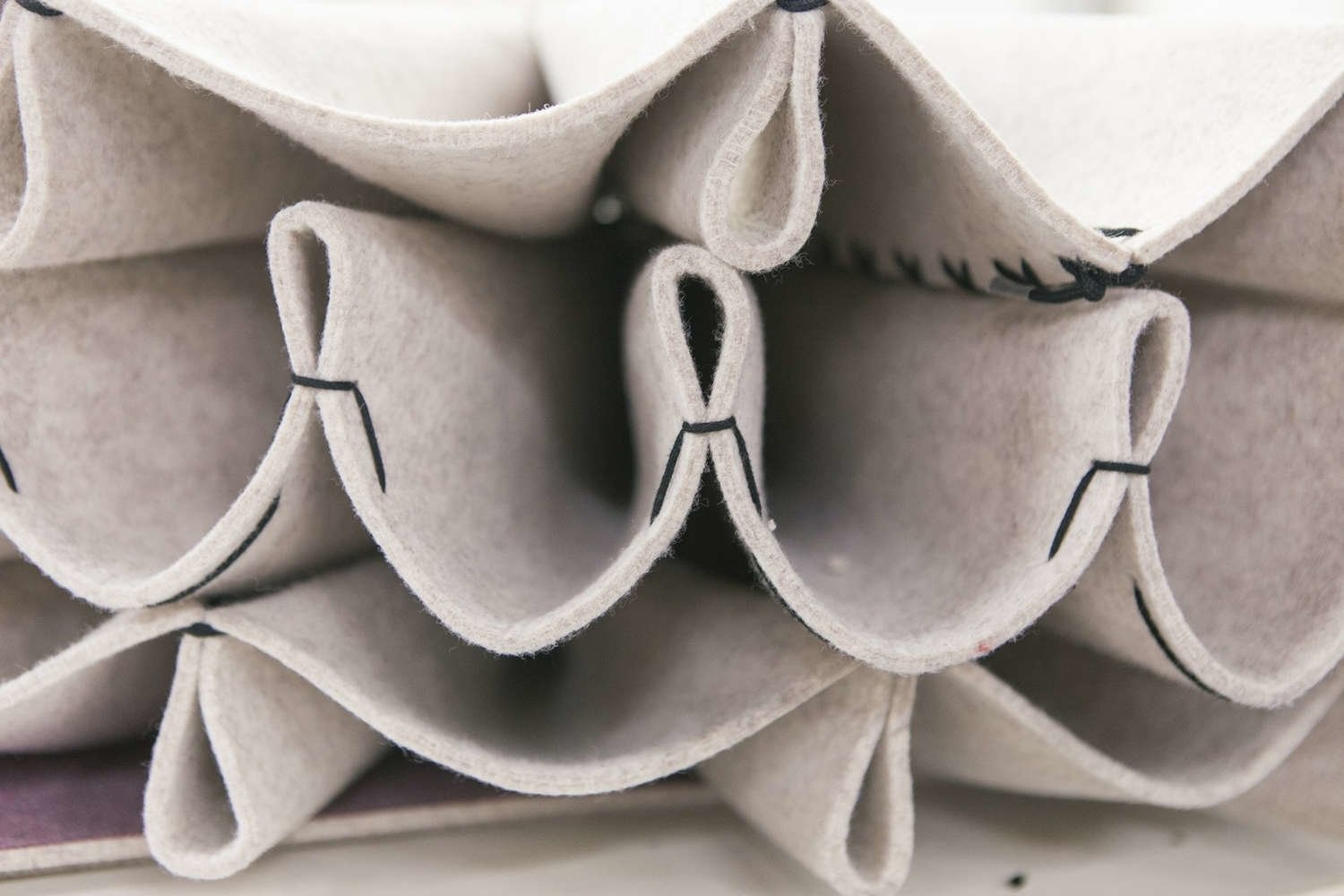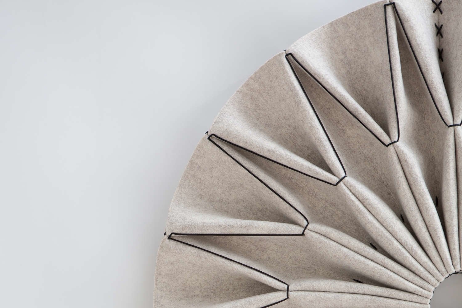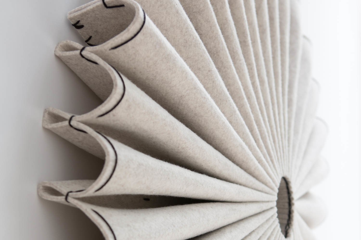 Plooi gemaakt van BuzziFelt (akoestische materiaal) in de kleuren: OffWhite, StoneGrey, Lime of Antraciet. Kant in naturel of zwart.