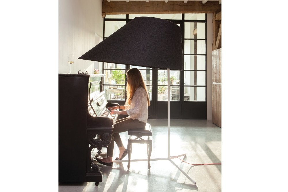 Buzzispace Buzzishade geluidsabsorberende verlichting. Buzzishade lampen zijn leverbaar in een XL en S variant. De lamp Buzzishade XL vormt een contrast tussen de elegante basis en de grote vilten lampenkap die lijkt te zweven in de lucht. De verstelbare lamp creëert een intieme ruimte en zorgt voor een aangename licht verspreiding. Het frame van de Buzzishade bestaat uit berkentriplex en wordt ondersteund door een dunne metalen basis. Het synthetische vilt kan vervangen worden door fineer of een plexiglas afdekking voor eventueel buitengebruik. De veters, waarmee de zijkanten zijn afgewerkt, zijn verkrijgbaar in de kleuren zwart en wit. De Buzzishade S is het kleine zusje van de XL.Buzzispace Buzzishade afmetingen: