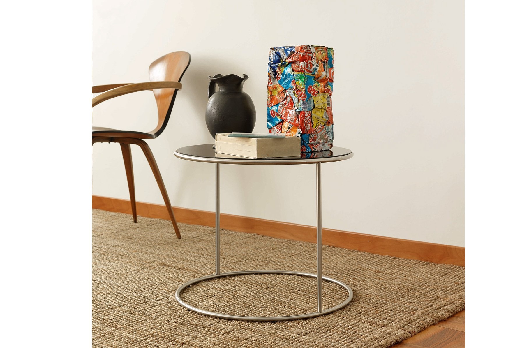 Cappellini Cannot, salontafel met een roestvrijstalen basis. De tafel heeft een afneembaar blad verkrijgbaar in de kleuren uit de collectie of natuurlijk hout.