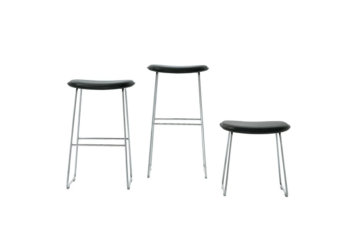 Cappellini Morrison, een collectie krukken in drie verschillende hoogtes. De zetes is gemaakt van gebleekt essen, walnoot of wengé. Ook kan er gekozen worden voor een bekleding met polyurethaanschuim met vaste hoes van stof of leder uit de collectie. De basis is gemaakt van geborsteld roesvrij staal en de kruk bevat polypropyleen voeten.