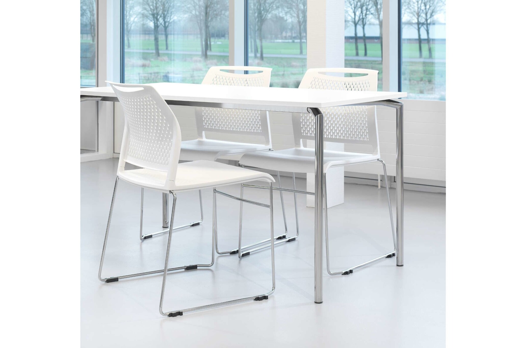 De tafel is te leveren met een vierkante of rechthoekige tafelbladen. Variërend van 70 x 70 cm tot 180 x 90 cm. De hoogte van de tafel is 75 cm en de frame buis heeft een diameter van 32 mm.