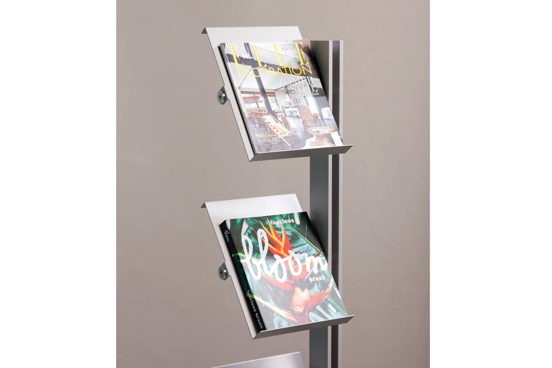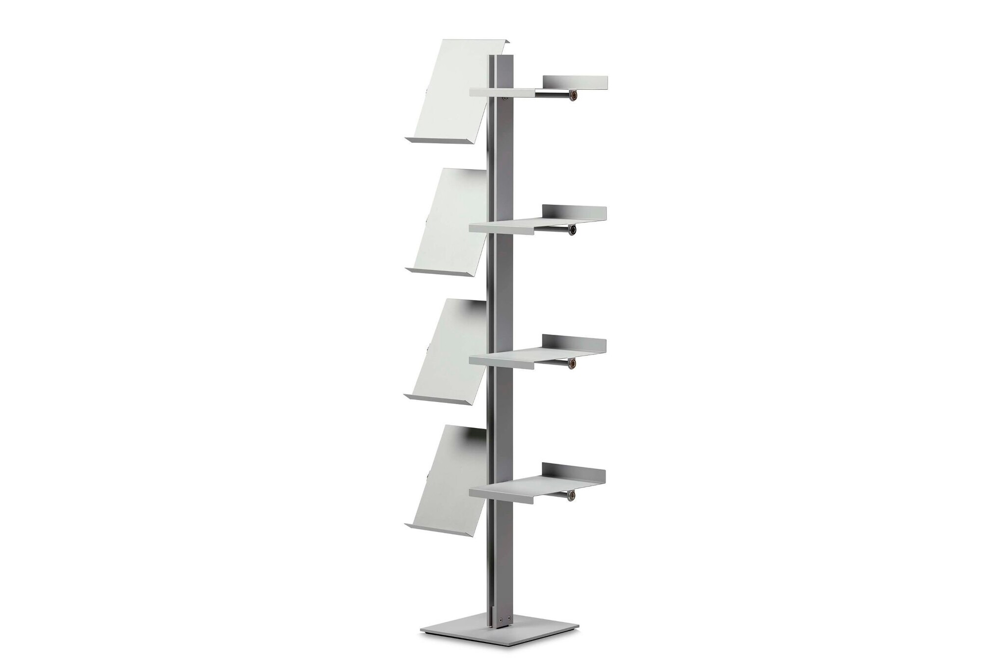Cascando Flexxible brochurehouder en/of boekenrek is leverbaar in diverse uitvoeringen, variërend van één tot vier panelen. Bij de Flexxible kunnen de panelen zowel schuin als horizontaal geplaatst worden. Fraaie details in gepolijst aluminium en de stabiele voet van staal geven het ontwerp kwaliteit en karakter.