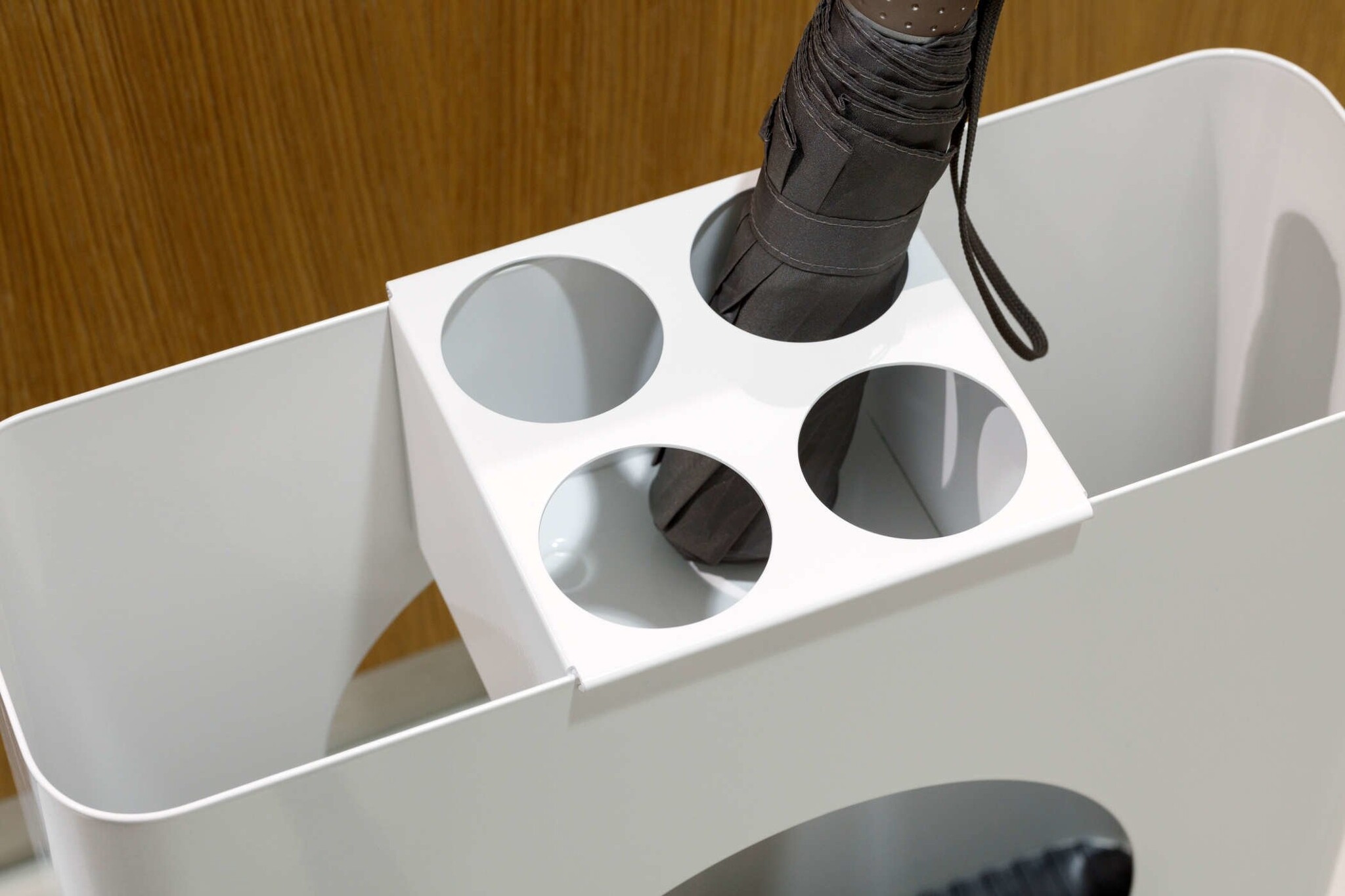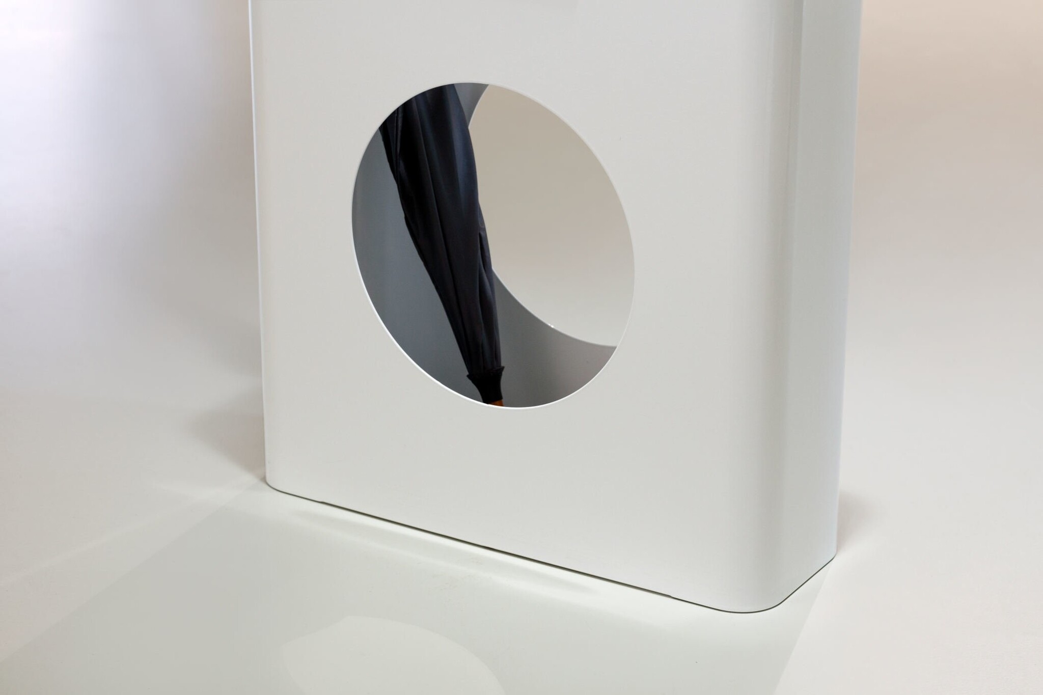 Hoge paraplubak met fraaie ronde hoeken. Vervaardigd uit staal, perfect afgewerkt zonder naad. Kleuren: wit, grijs of staal Materialen