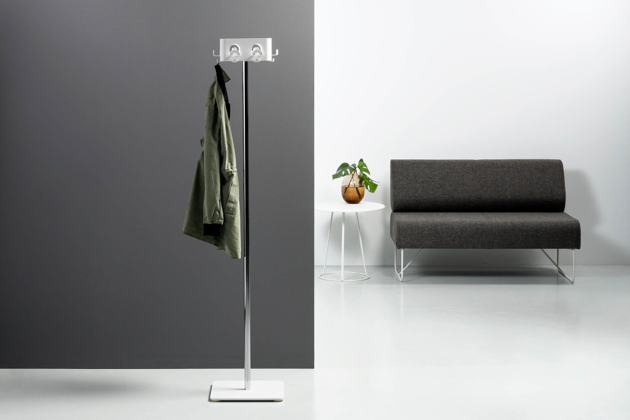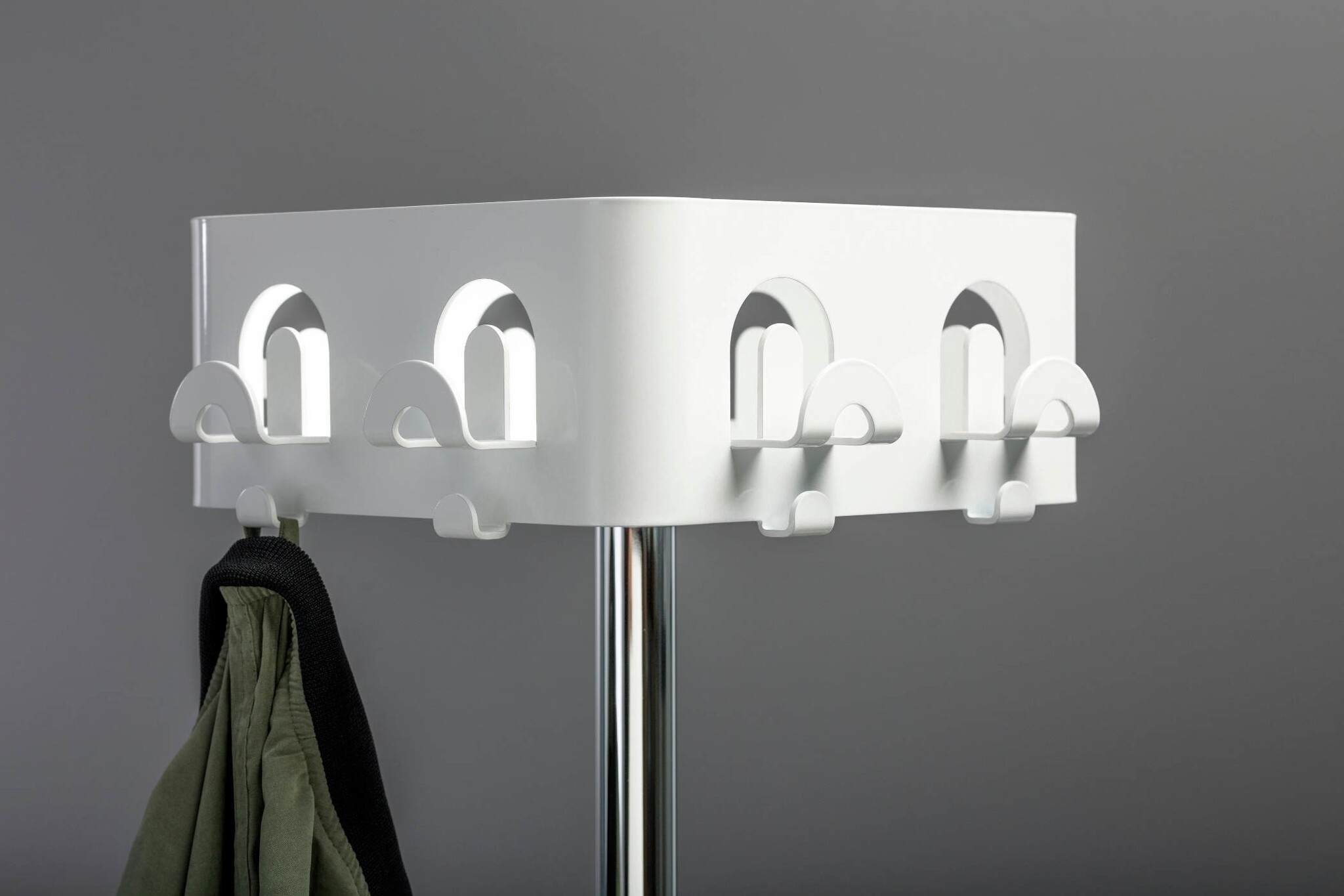 Cascando Flow Square is een garderobestandaard die gekenmerkt wordt door de fraaie garderobekroon. De staander is glanschroom die het geheel, in combinatie met de kroon, een strak maar speels uiterlijk geeft. De voet is gemaakt van staal en voorzien van een aluminium coating. De Flow Square is voorzien van acht grote haken met kleine haakjes eronder.