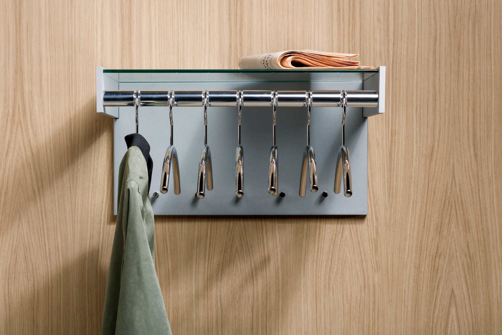 De wandgarderobe Hangon large is, qua materiaal en uitvoering, identiek aan Hangon 7, echter is Hangon 12 voorzien van een achterwand met extra jashaken. Hangon 12 is verkrijgbaar in twee breedtematen en geschikt voor zeven of twaalf kledinghangers. Hangon 12 is verkrijgbaar met en zonder rillen. Een combinatie van gepolijst aluminium en glas geven de garderobe elegantie.