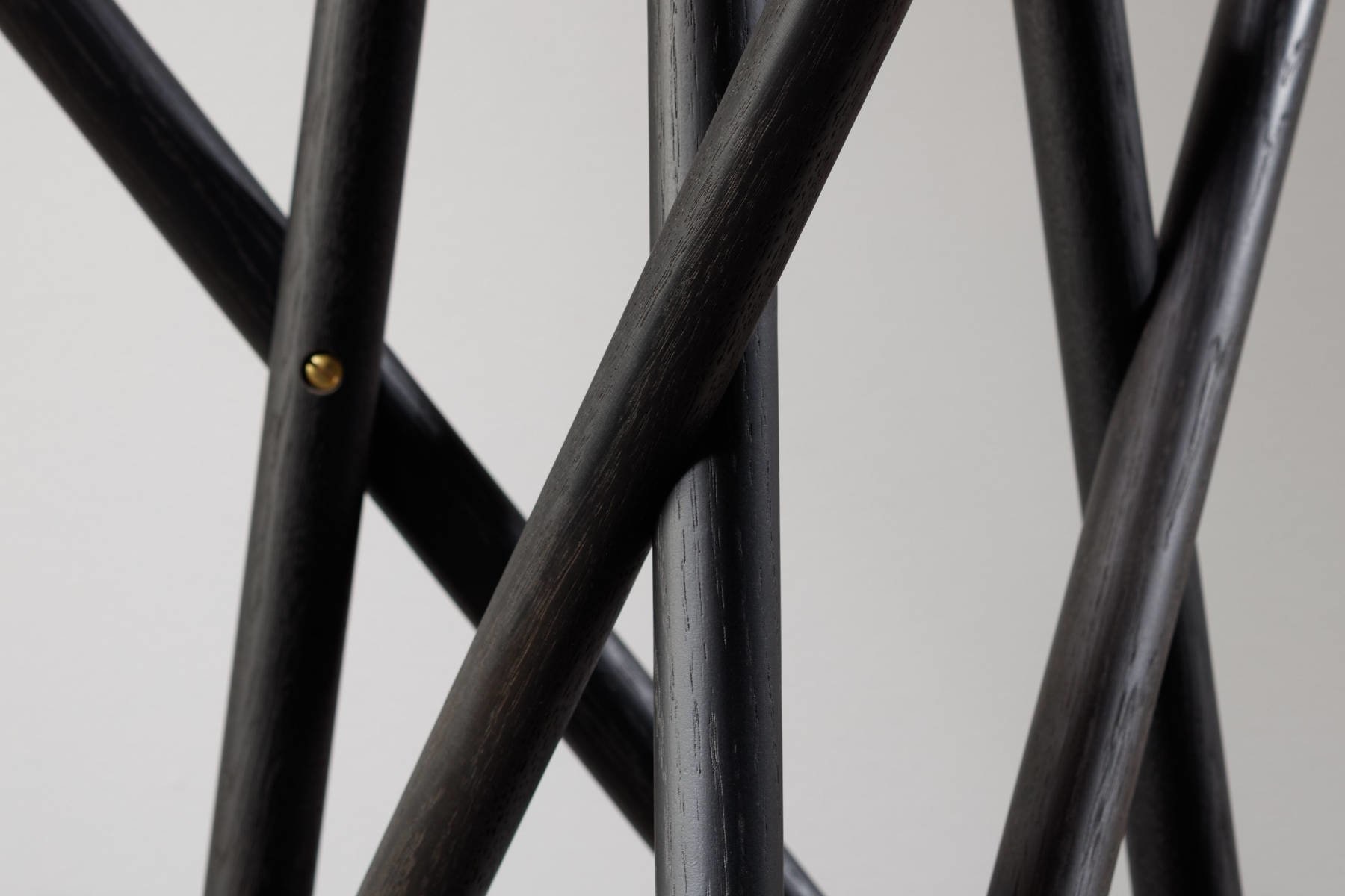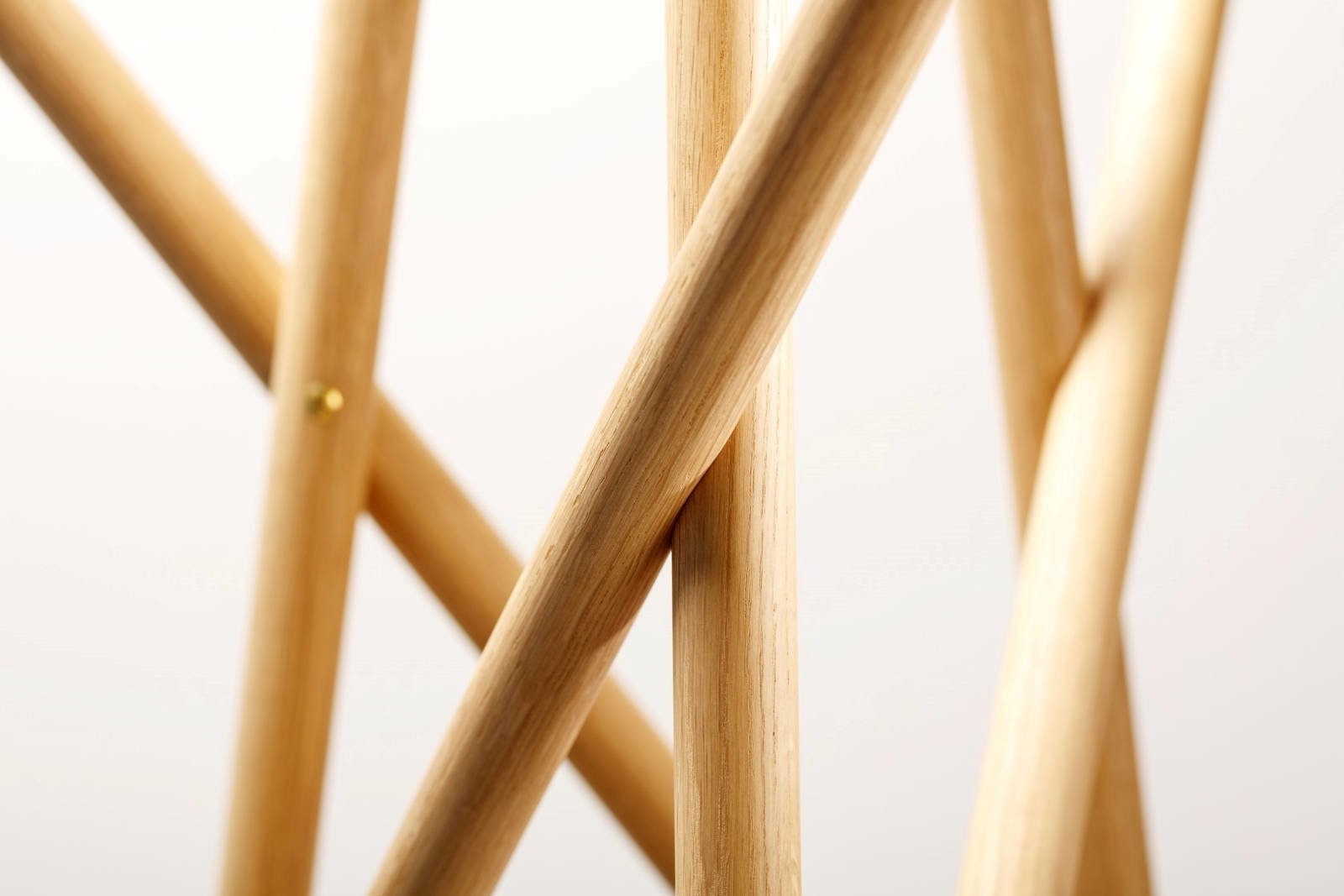 De eikenhouten stokken vallen mooi in een expressieve hoek en elke kant is in symmetrie.
