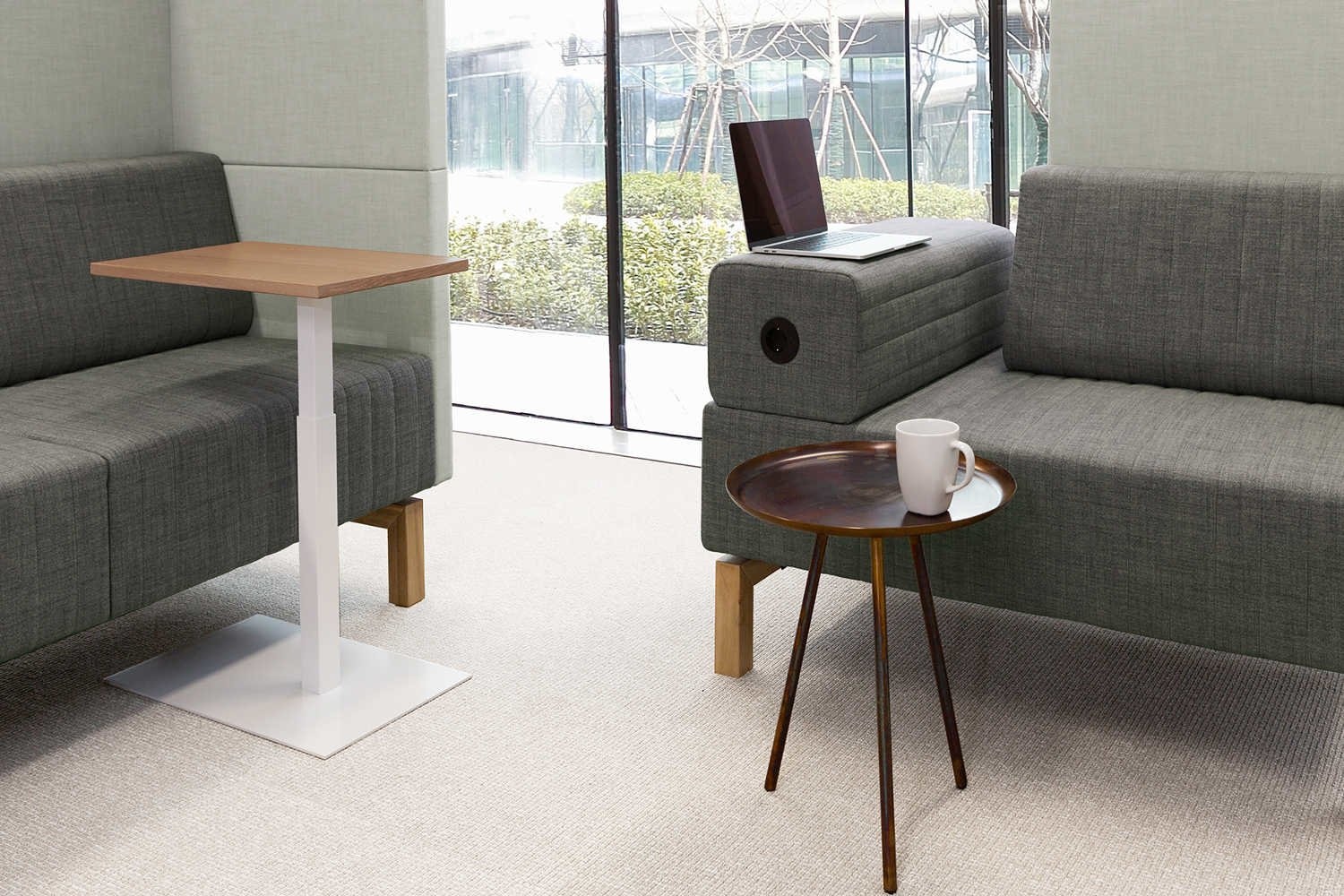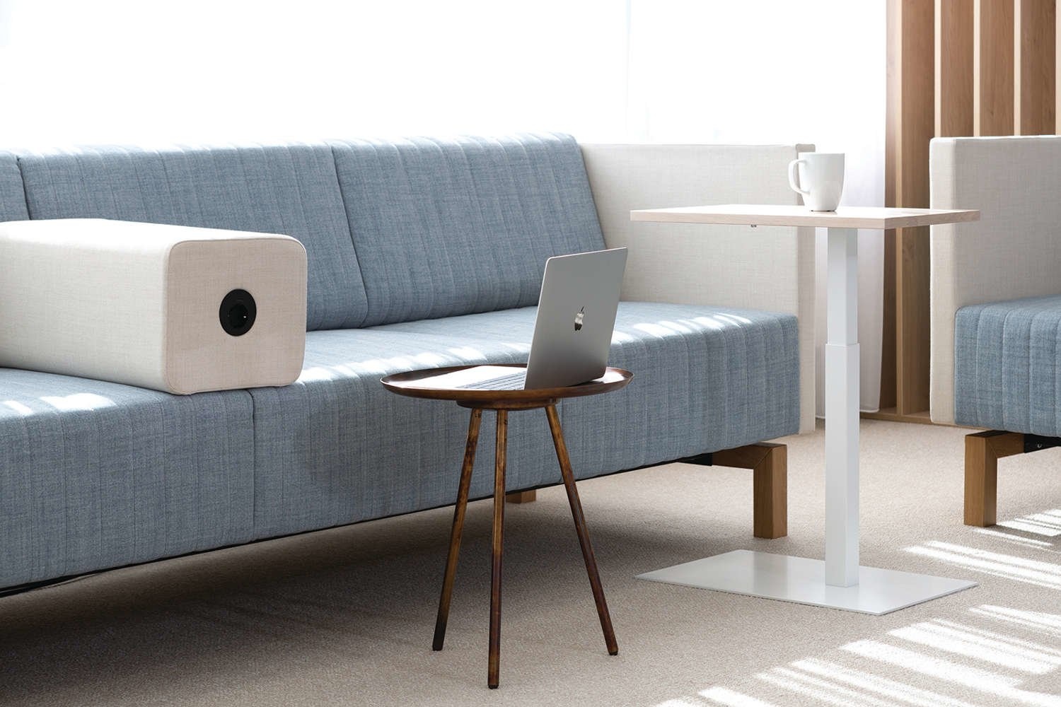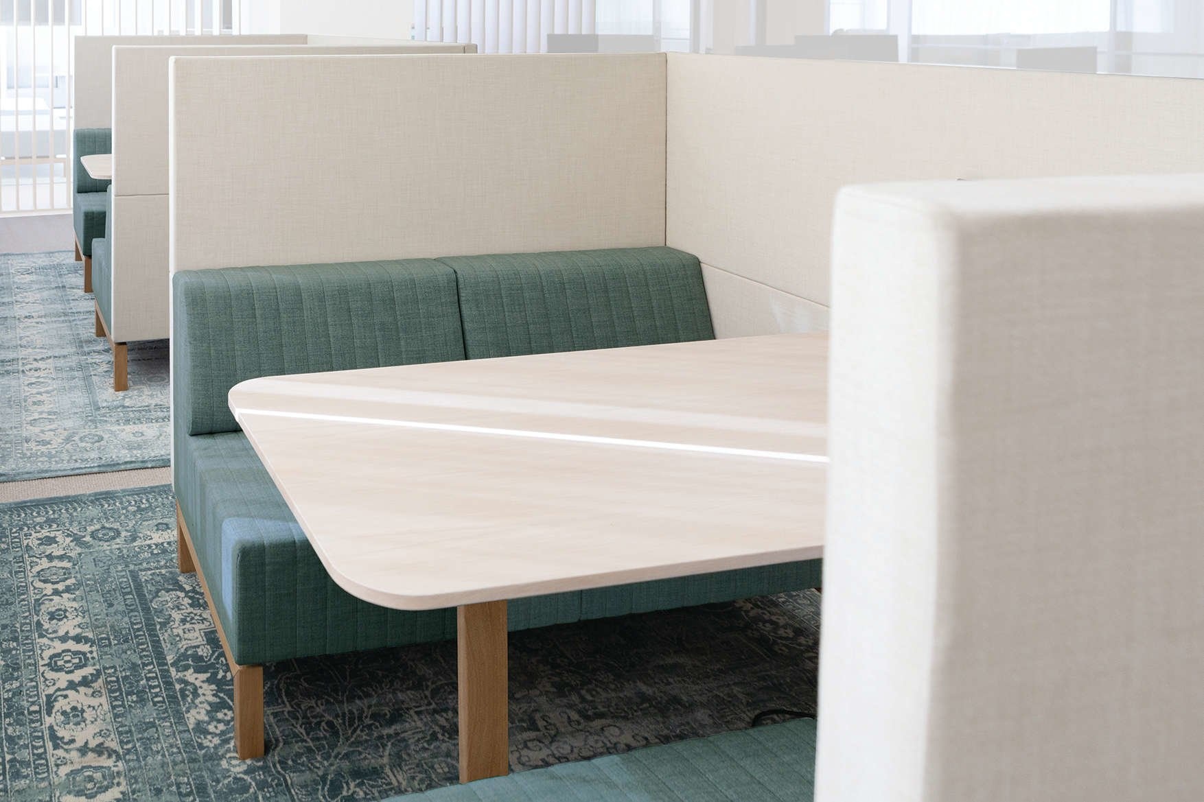 De bank heeft een akoestische wand, wat betekent dat de akoestiek in de ruimte wordt verbeterd, maar ook dat de gebruiker minder geluidsoverlast ervaart.