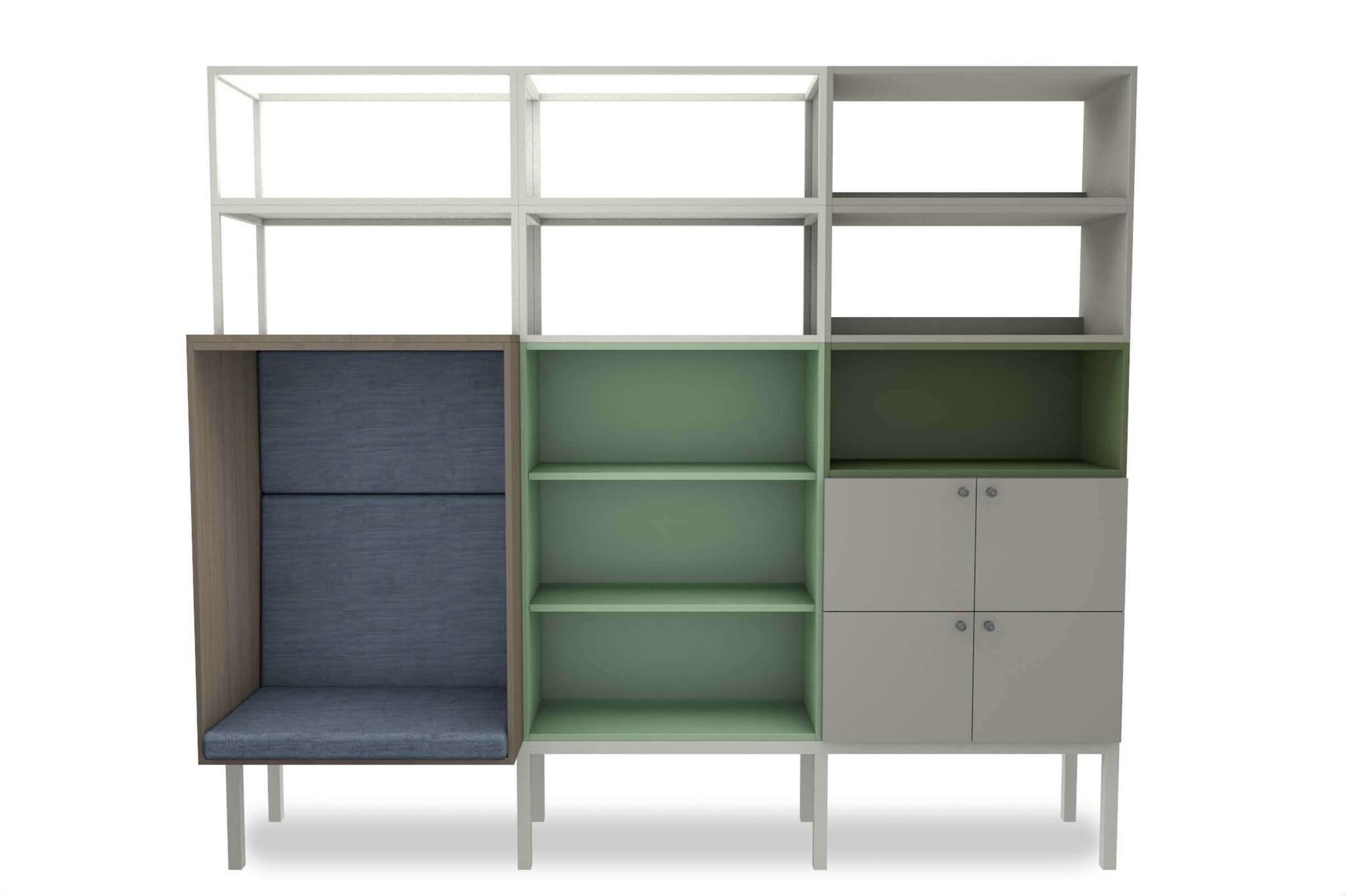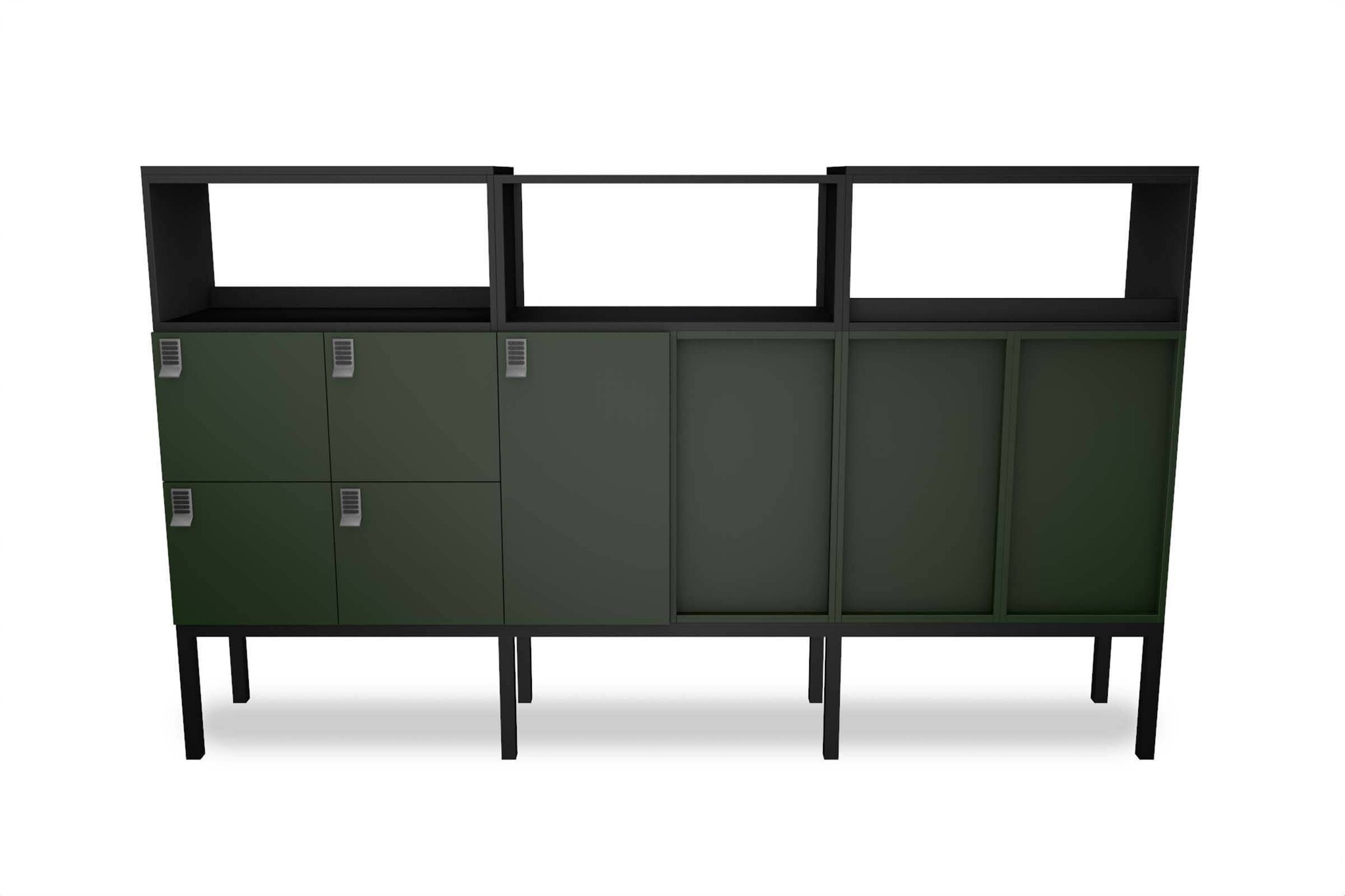 Stackr kast is opgebouwd uit een plint, rompen (met of zonder deurtjes) en een bovendek.