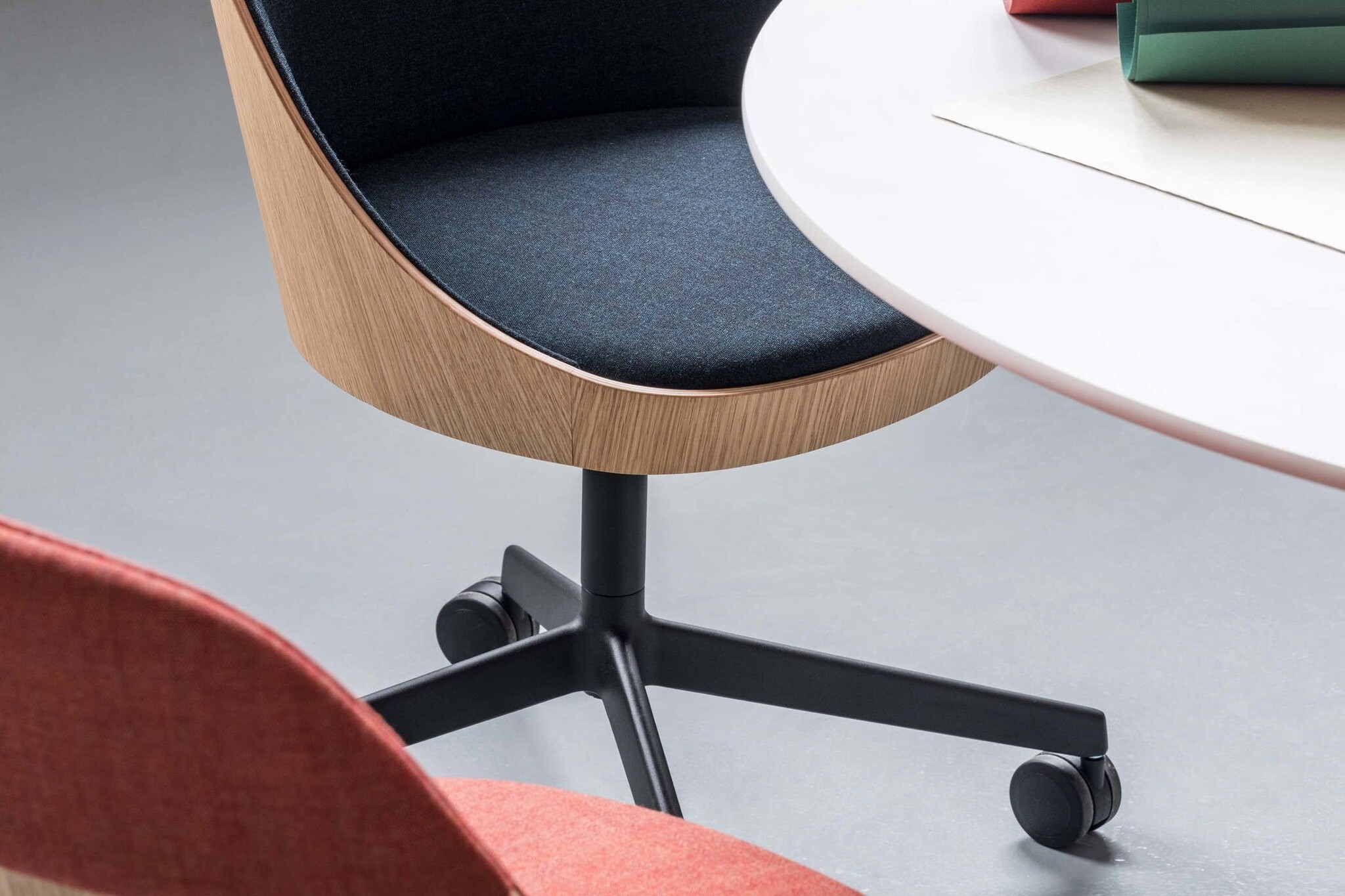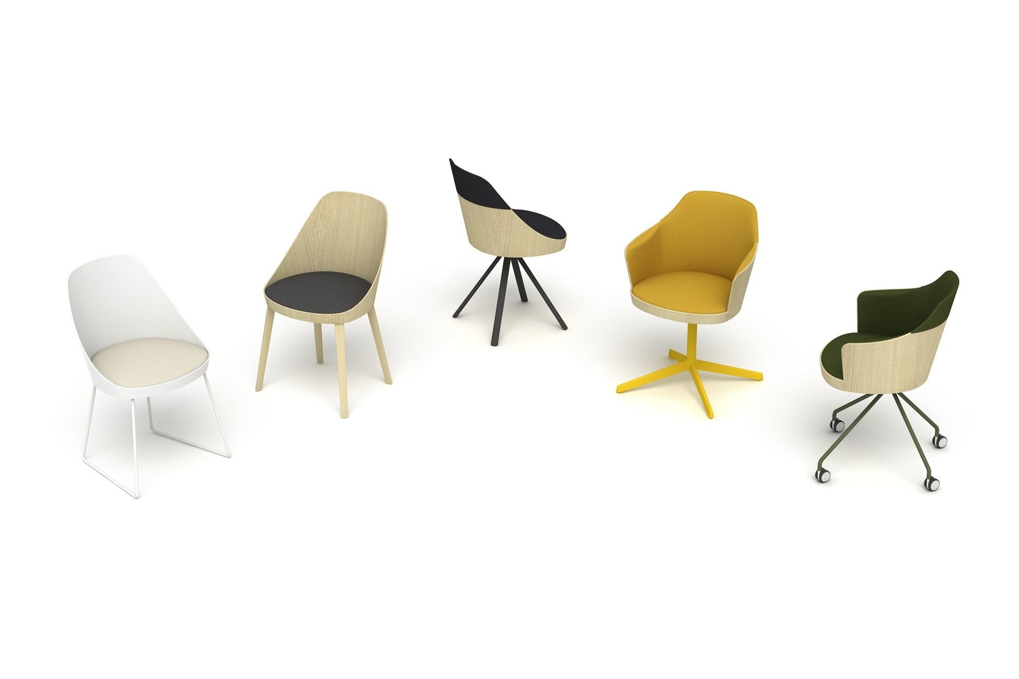 Leverbaar met verschillende onderstellen: vier poten in massief eiken, geïnjecteerd aluminium 4- of 5-poots onderstel (met of zonder wielen).