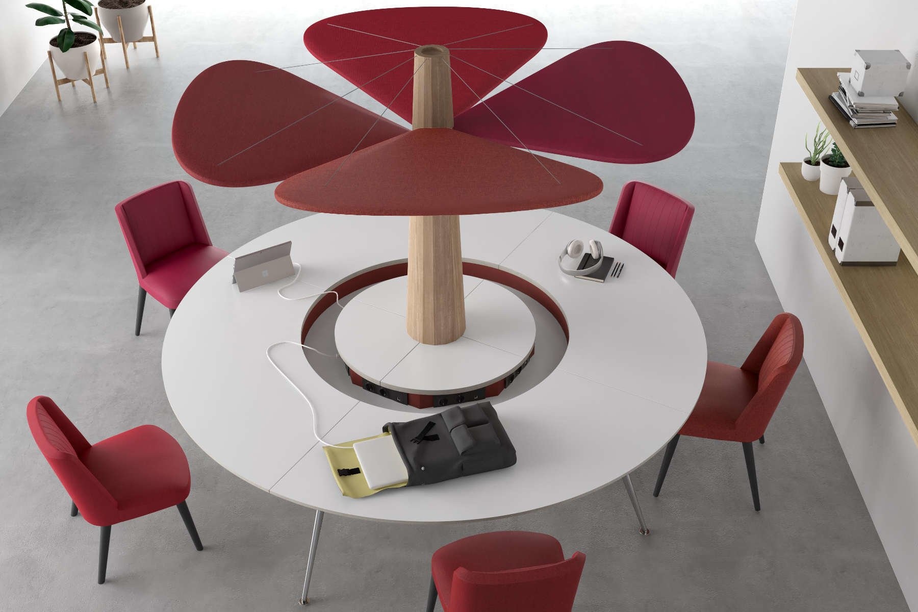 In het midden van de tafel bevind zich een blok met elektrificatie én een standaard met een soort ‘plafond’ die als het ware de tafel overdekt. Dit worden ook wel helikopter bladeren genoemd. Deze bladeren hebben een functie: ze geven licht (LED) én ze verbeteren de akoestiek in de ruimte, gezien ze geluid absorberen.