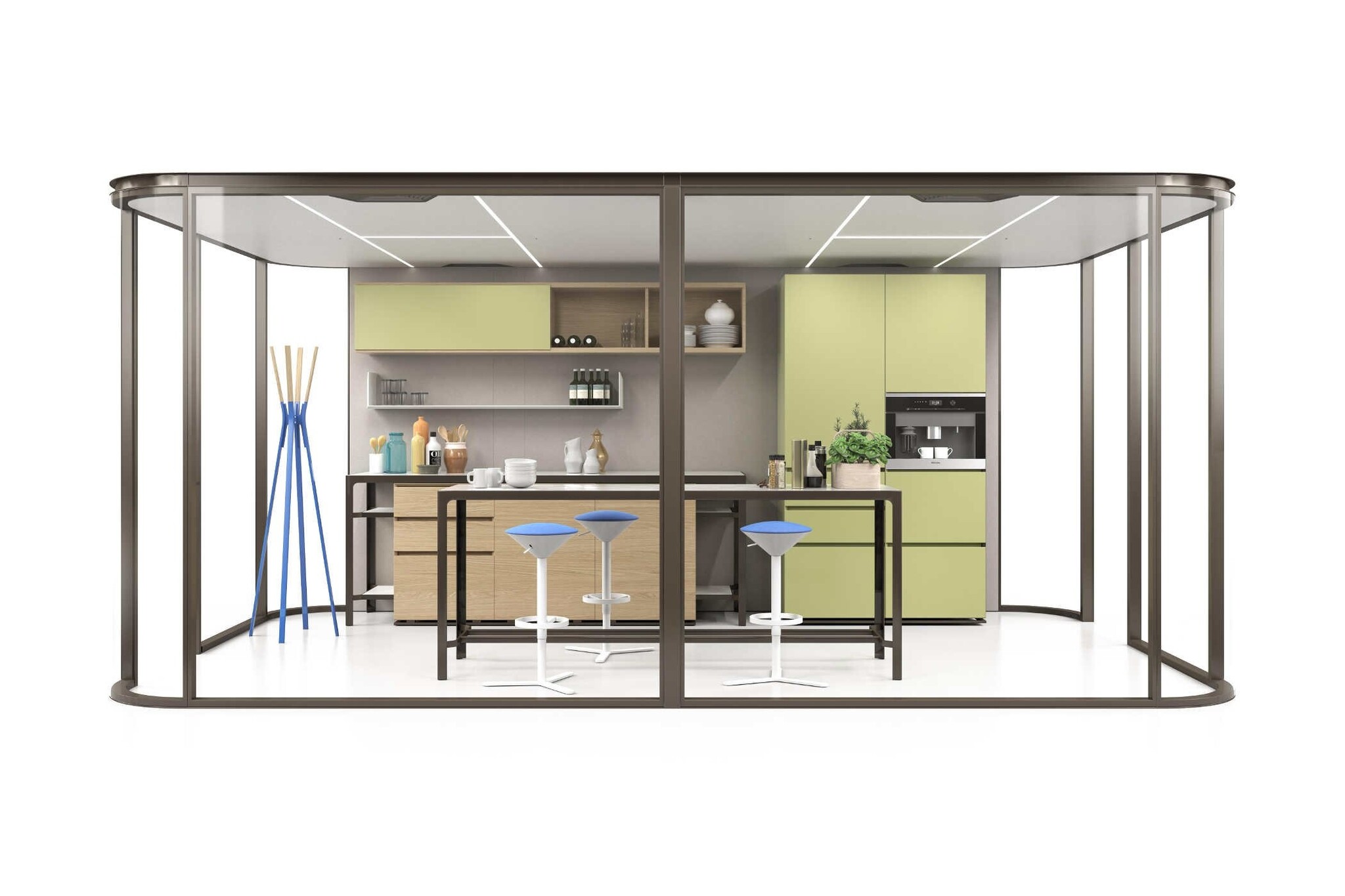 De Estel Collaborative Room X ook in uw ruimte? Dat kan uiteraard! Deze geluidsdichte ruimte is ideaal wanneer u een concentratiewerkplek, vergaderruimte of relaxruimte wil creëren op de werkvloer. Vanwege de glazen deuren blijft u dan toch betrokken. Kenmerken van de Estel Collaborative Room X