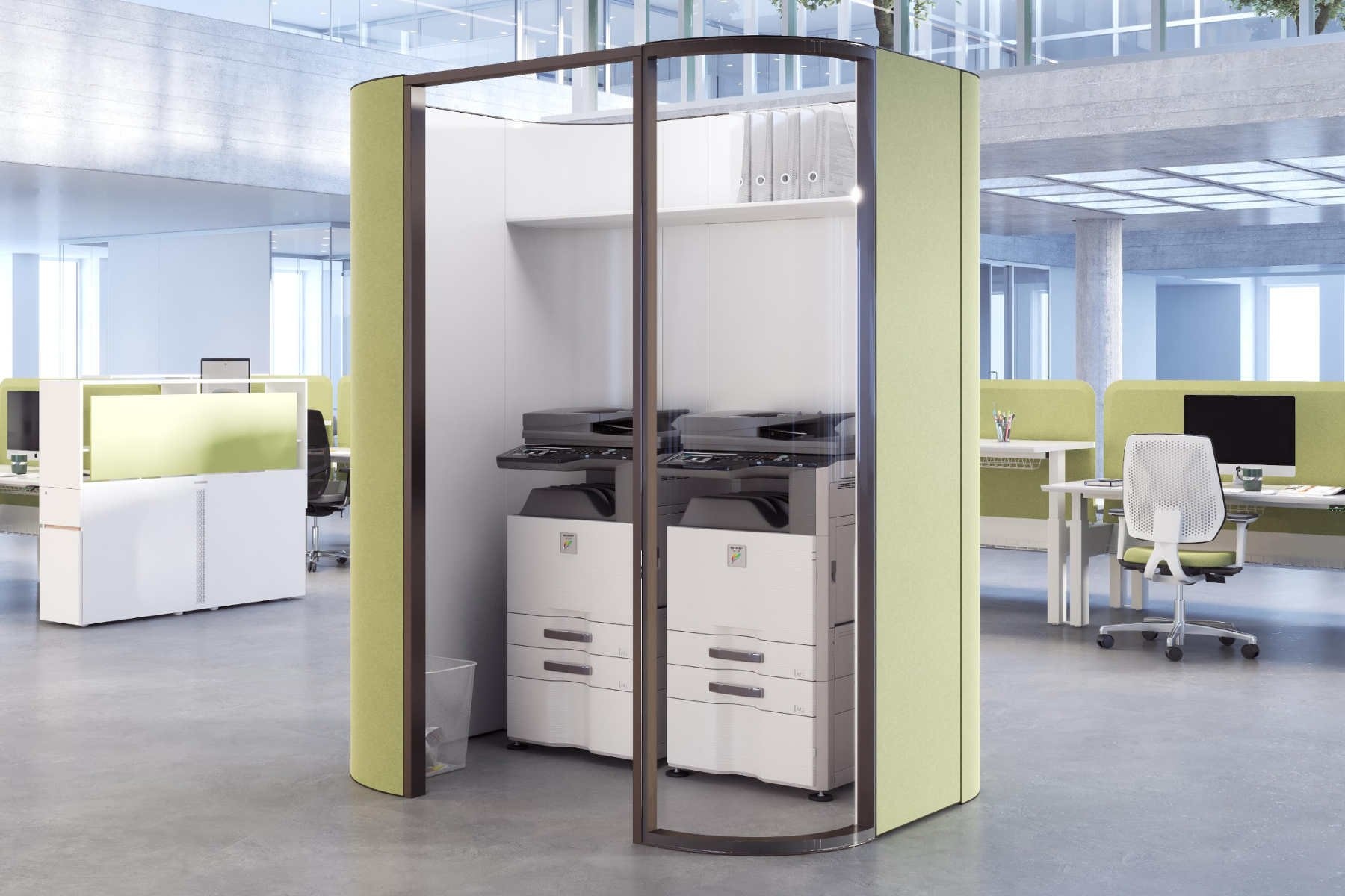Een ideale akoestische oplossing voor op het kantoor: Estel Collaborative Room XS. Deze cube is groot genoeg om twee kopieerapparaten/printers in te zetten, maar ook om te gebruiken als 1-persoons werkplek. Door de ronde hoeken wordt een elegant effect gecreëerd. Estel Collaborative Room XS kenmerken