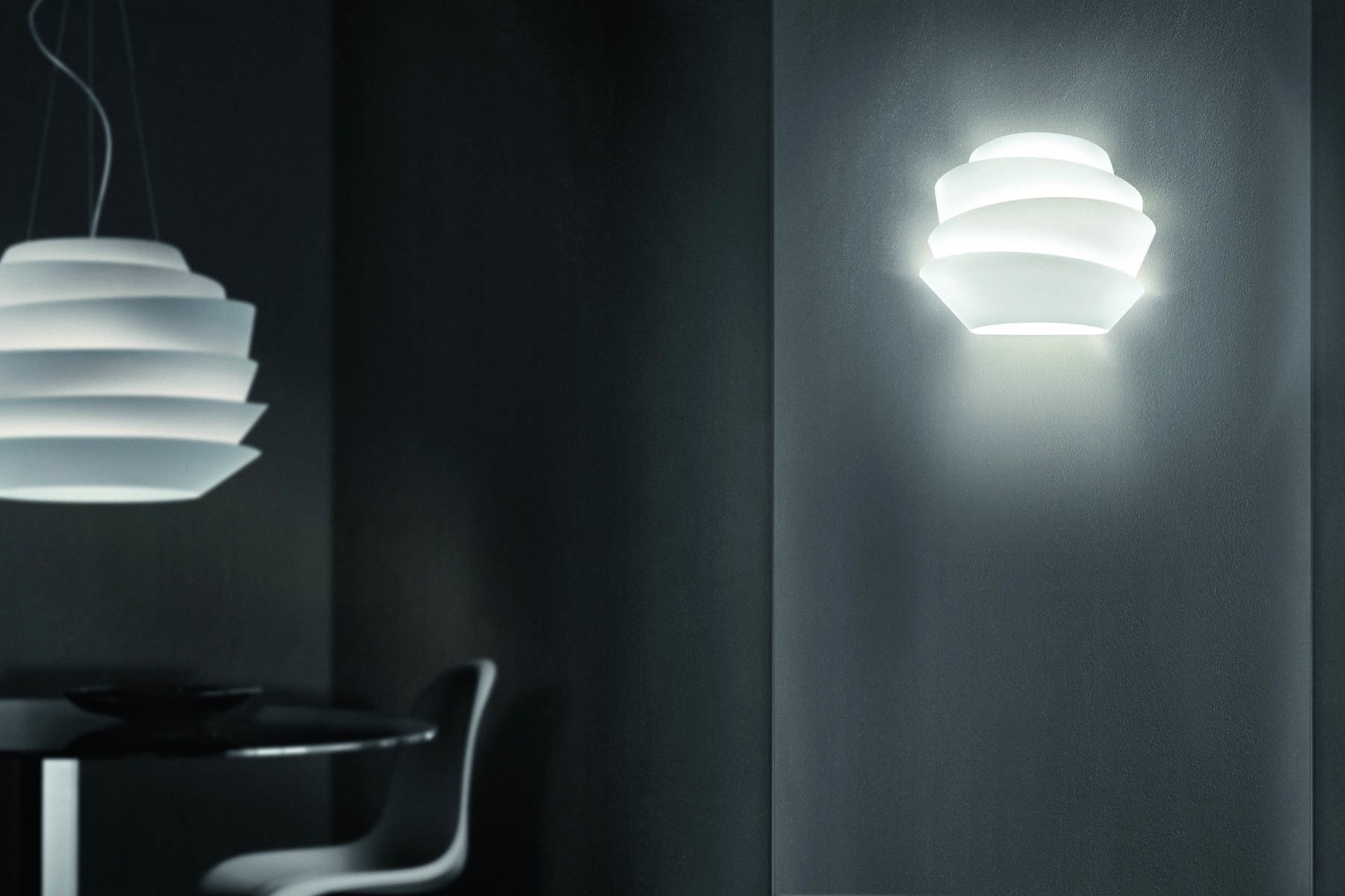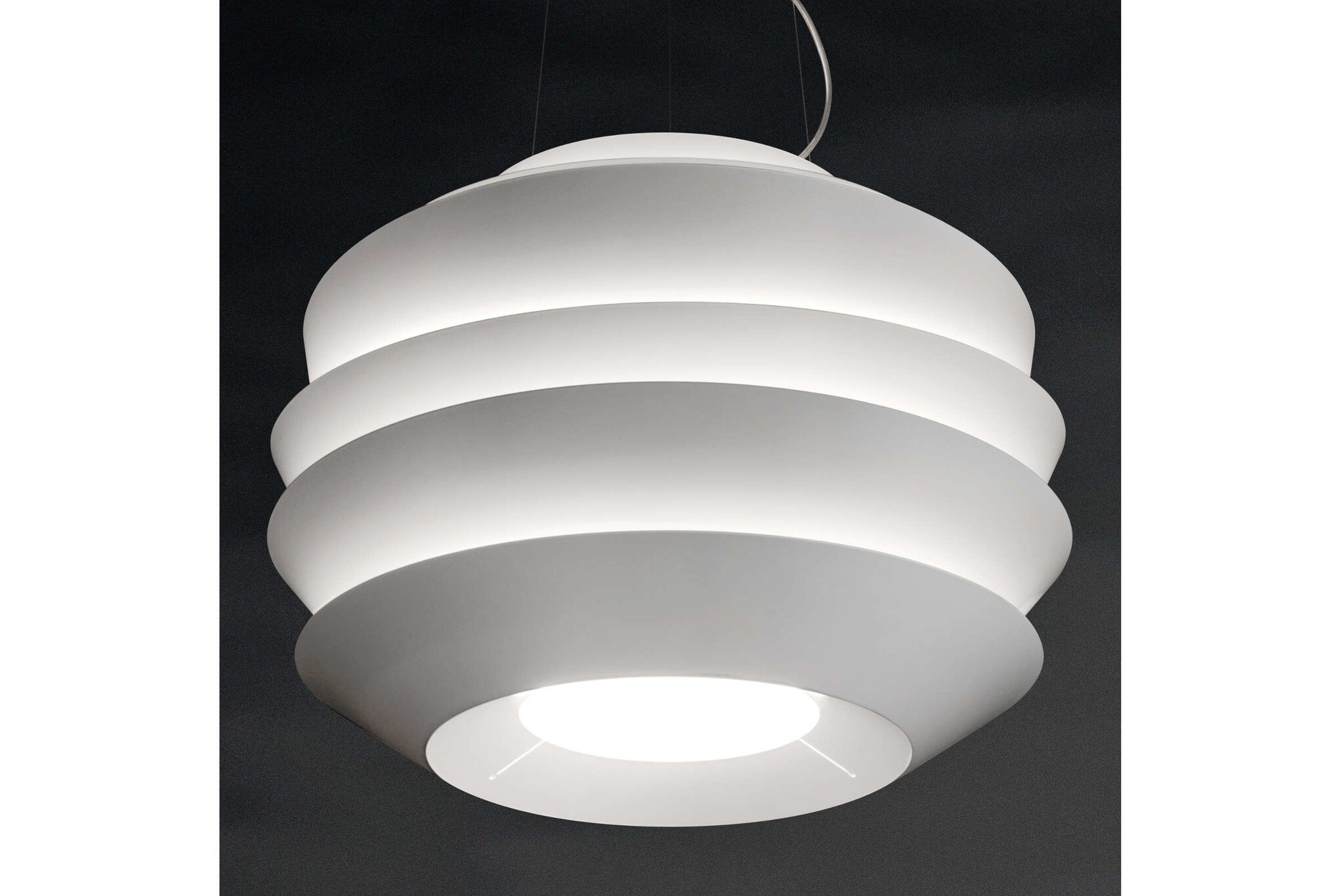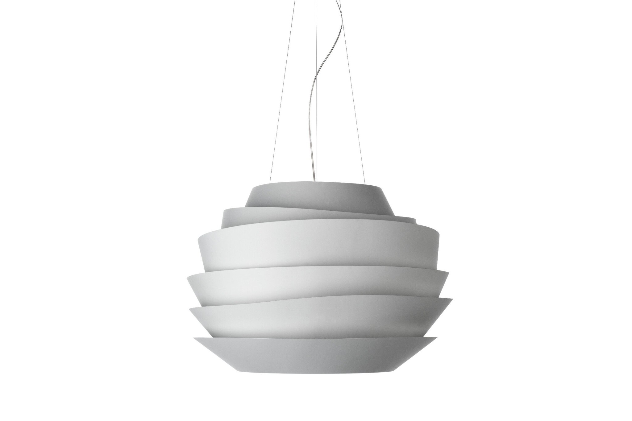 Foscarini Le Soleil een plafondlamp gemaakt van polycarbonaat. Le Soleil bestaat uit asymmetrische banden, die een leidende rol spelen in de verspreiding van het licht. De Le Soleil, verlichting, is leverbaar in wit. Naast de hanglamp is er ook een wandlamp leverbaar ook in de kleur wit.