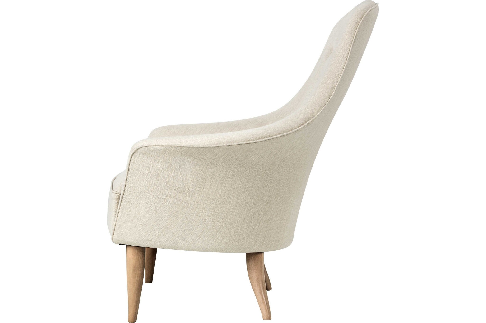 De fauteuil is verkrijgbaar met houten poten in eiken, Amerikaans noten of zwart gebeitst.
