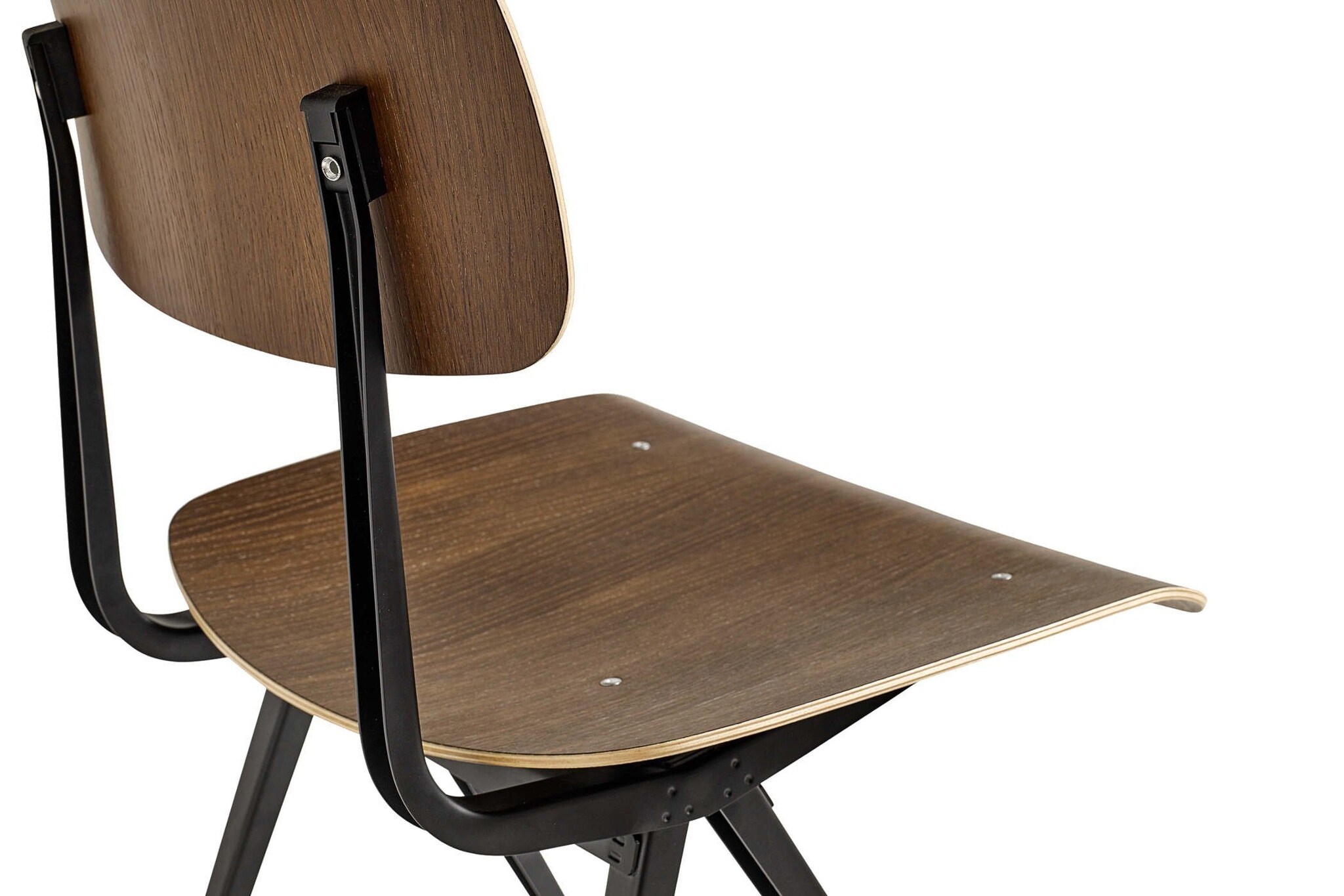 Voorgevormde plywood zitting en rugleuning. Top fineer is in eik. Stalen poten.