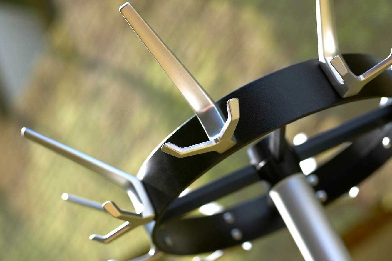 De kapstok heeft een ronde kroon van gegoten aluminium.