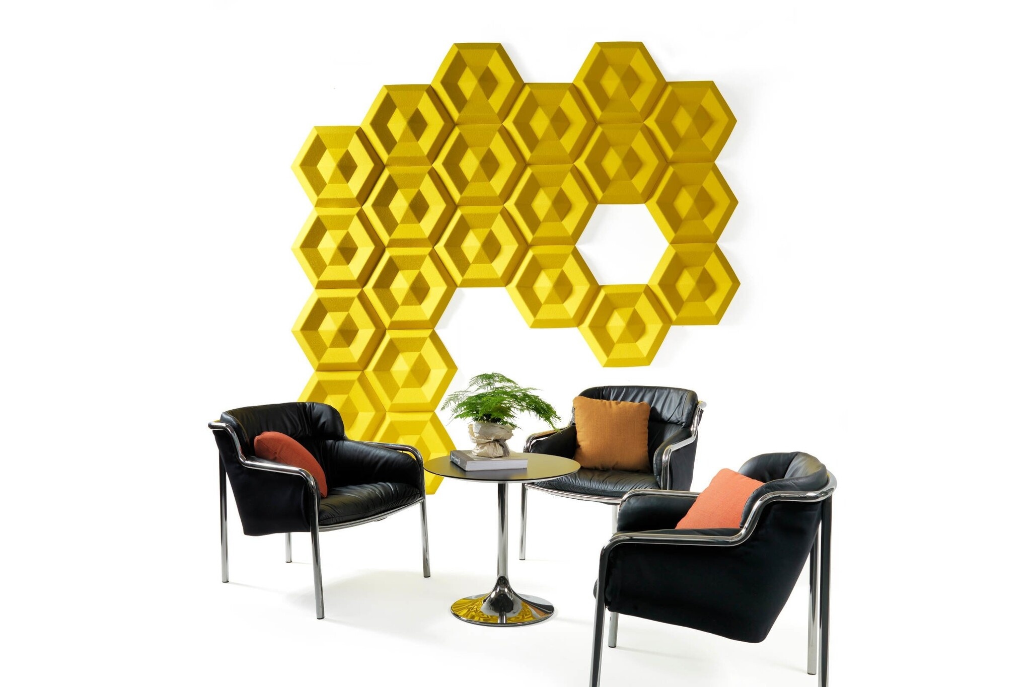 Geïnspireerd door de natuur, Beehive is Engels voor bijenkorf en de bij bouwt zijn bijenkorf met dit patroon louter vanwege haar sterke structuur en vereist een minimum aan materialen. Nu is deze vorm van was gebruikt om deze geluiddemper voor op de muur te creëren. De Johanson Beehive is een geluiddemper dat geluid vermindert, zoals lawaai en stemmen. Hij is eenvoudig te monteren op de muur. Eigenschappen Johanson BeehiveDe Beehive akoestische wandpanelen zijn leverbaar in verschillende kleuren, zoals zwart / donker grijs / lichtgrijs en gebroken wit en zijn gemaakt van ecologische producten; 60 - 70% petflessen aangevuld met andere materialen die het vilteffect geeft. Optioneel zijn de akoestische panelen te bekleden met Europost. Hierbij is een keuze uit 48 kleuren.