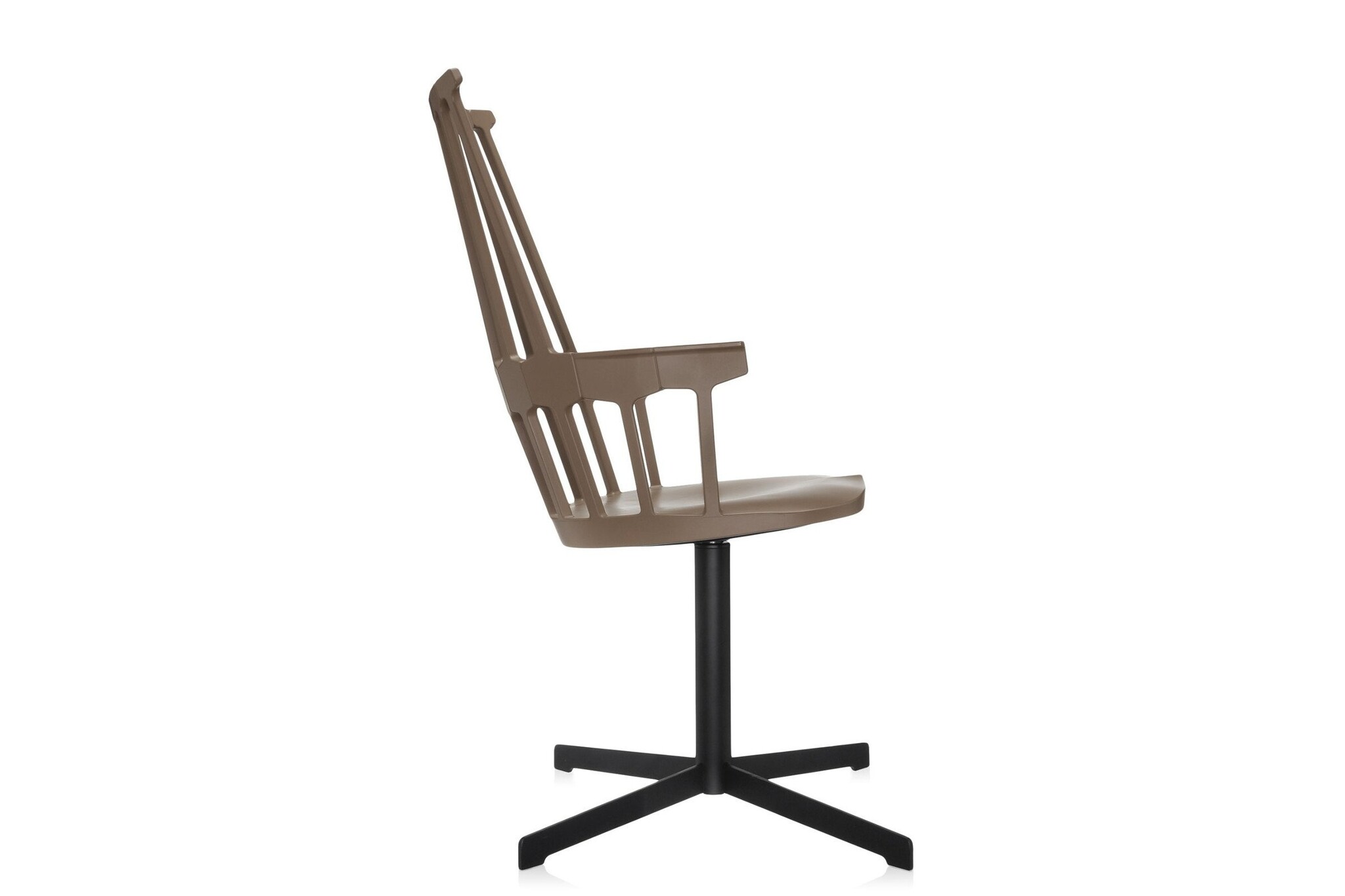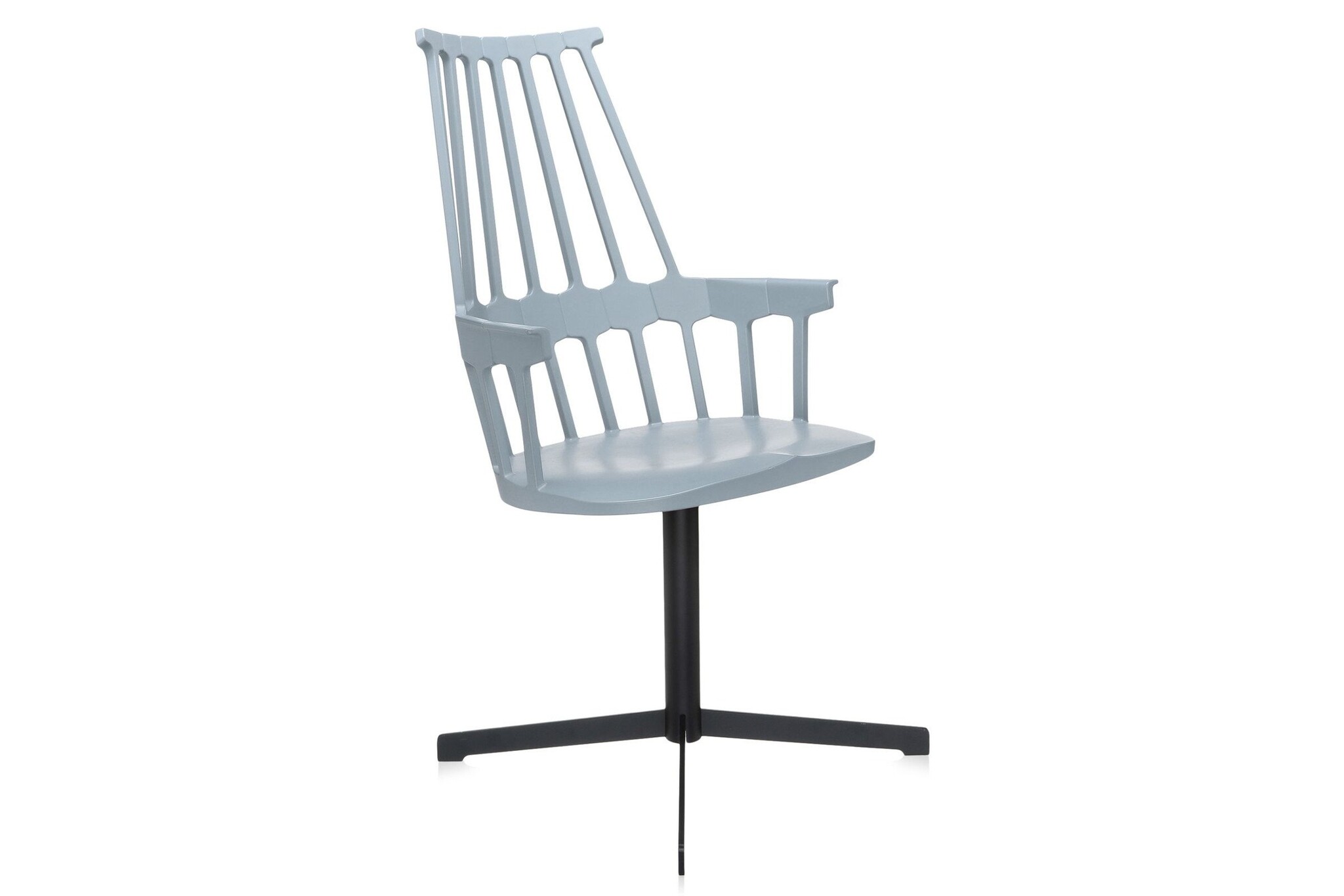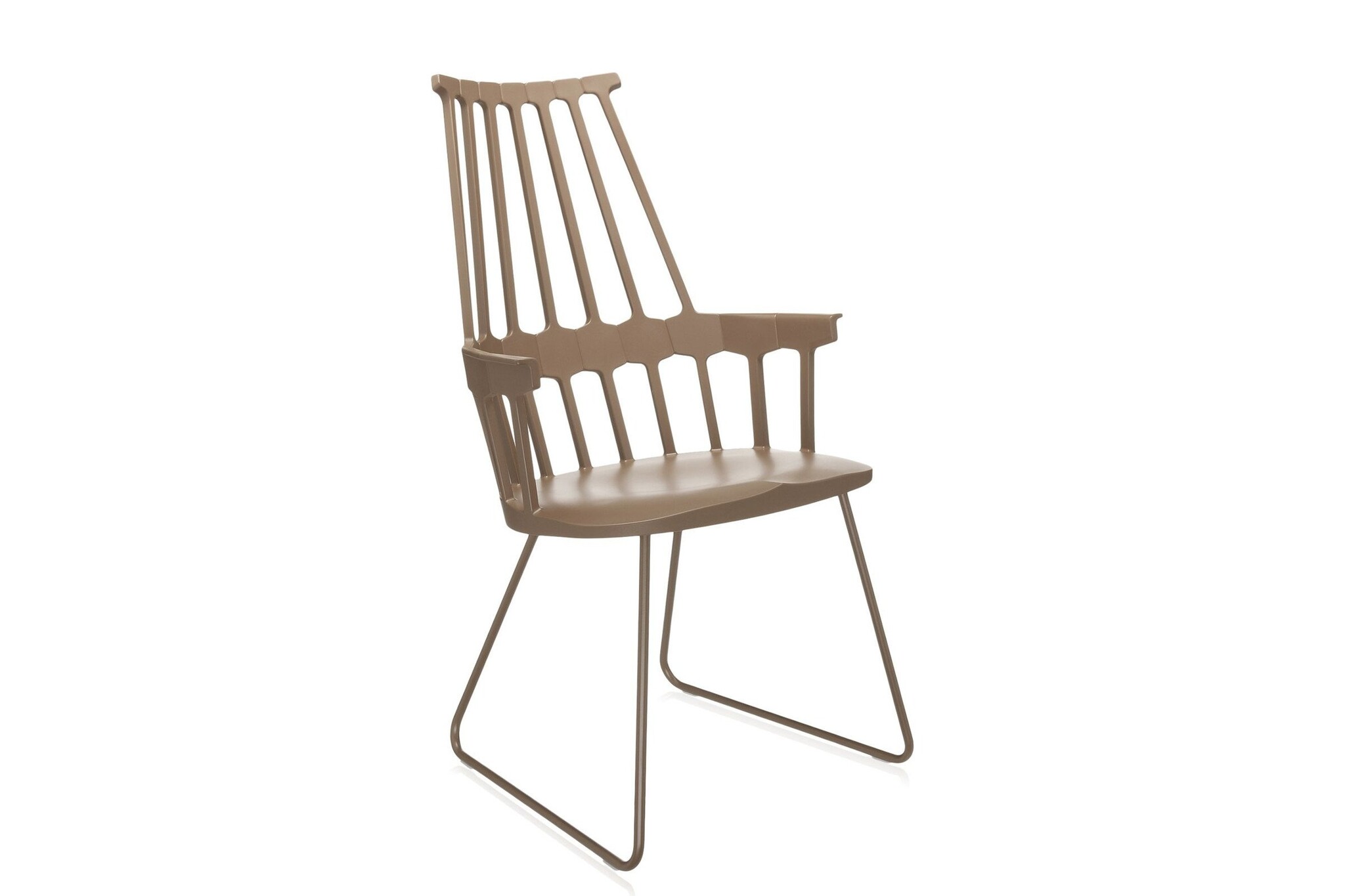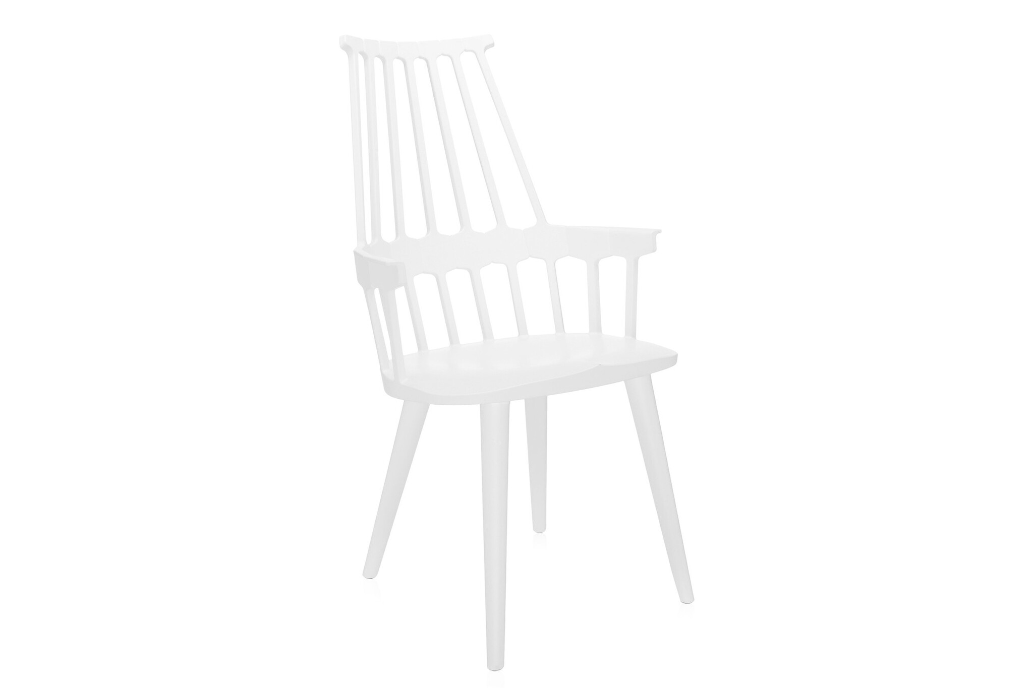 Kartell Comback heeft een rugleuning die bestaat uit zeven staven die samenkomen in een zeshoekige structuur die vastzit aan het zit gedeelte. Het frame is gemaakt van technopolymeer thermoplastic en de stoelpoten van eiken gebeitst of gelakt essenhout. De stoel is leverbaar in zes matte kleuren. De Comback stoel is goed toe te passen als restaurantmeubilair.