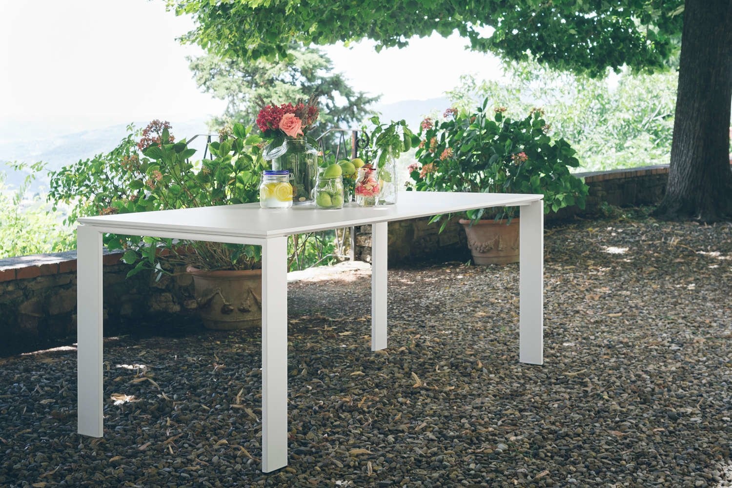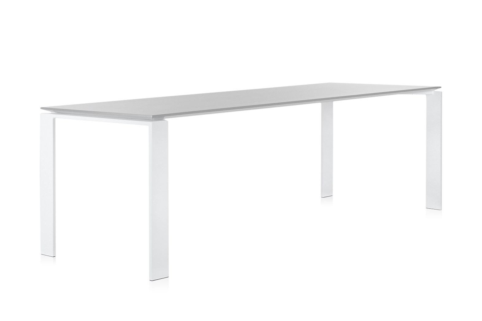 Kartell Four een functionele en verfijnde tafel. Dankzij de elegante designoplossing maakt de positie van het tafelblad het mogelijk om makkelijk ladekastjes of meubilair voor computers op te stellen. De Four tafel is beschikbaar met een tafelblad in gelaagd laminaat van 2,5 cm dik op een structuur van gevermist staal. Het gelamineerde aluminium blad maat de Four representatieve tafel, niet alleen ideaal als vergadertafels of directiebureaus maar ook geschikt voor de woonmarkt. Kartell Four varianten:Four tafelblad in gelaagd laminaat van gevernist staal