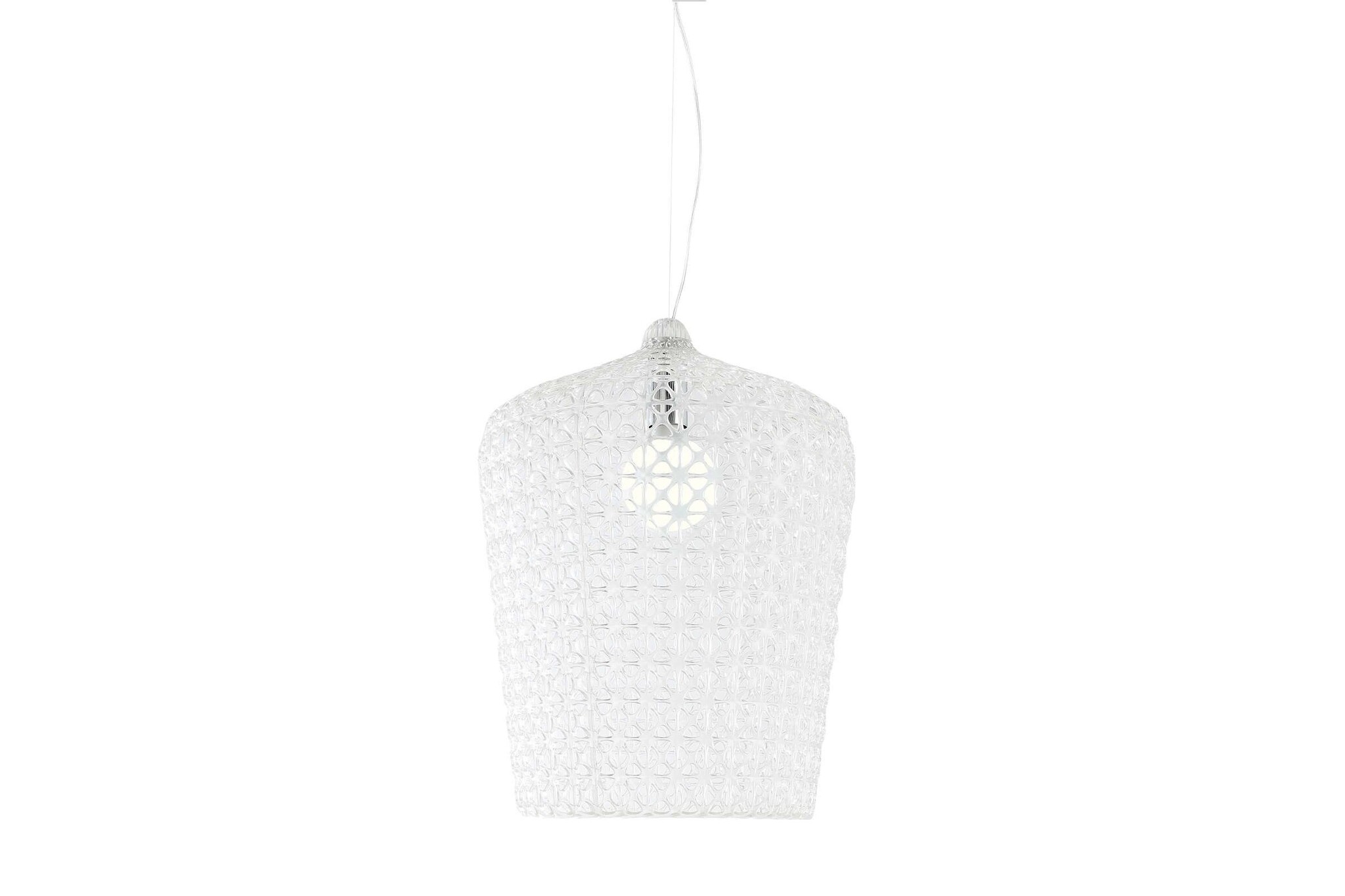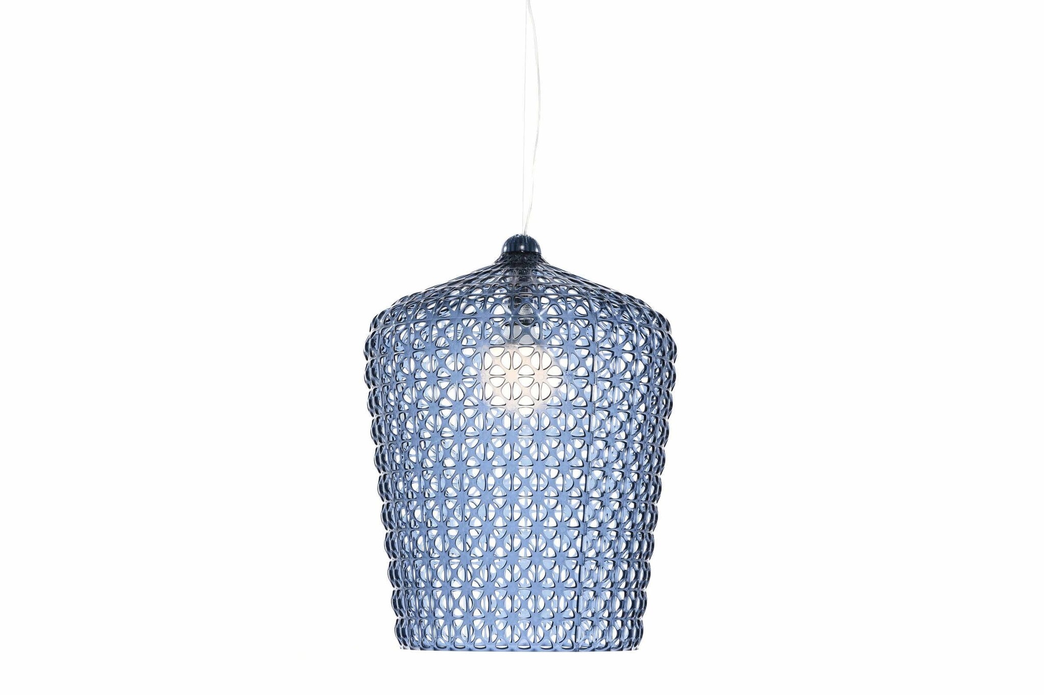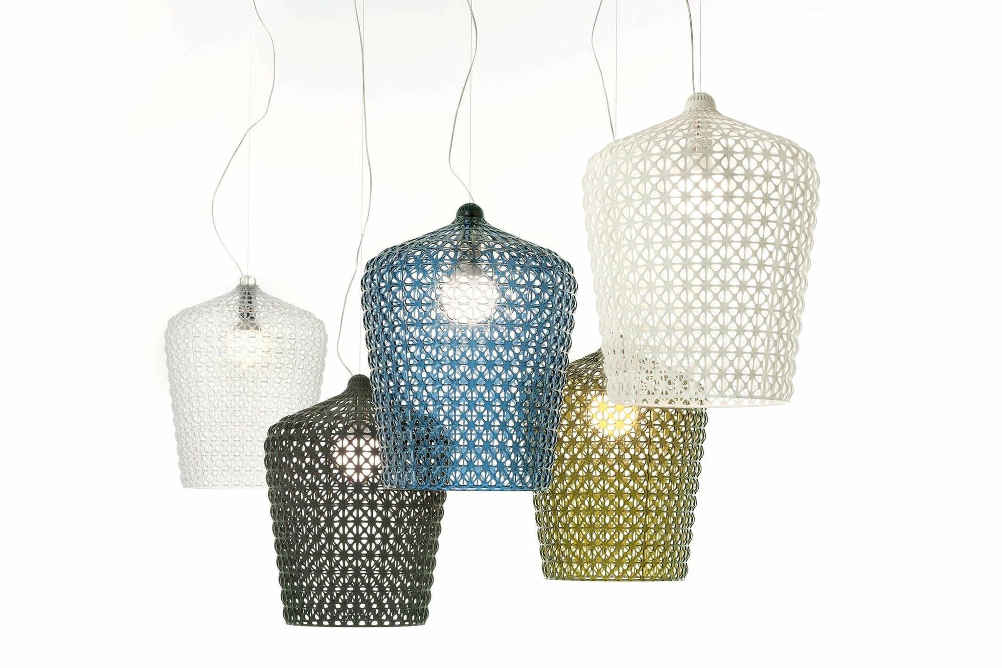 De Kartel Kabuki is een collectie van hanglampen en vloerlampen in vijf kleuren: lichtblauw, kristal, groen/goud, zwart en wit. De gebruikte technologie maakt het mogelijk om een geweven structuur van de lampenkap te creëren die lijkt op kant met een uniek geperforeerd oppervlak waardoor het licht op een speelse wijze wordt verspreid. Of u nu kiest voor de hanglamp of vloerlamp, in beide gevallen geeft het licht een mooi patroon.