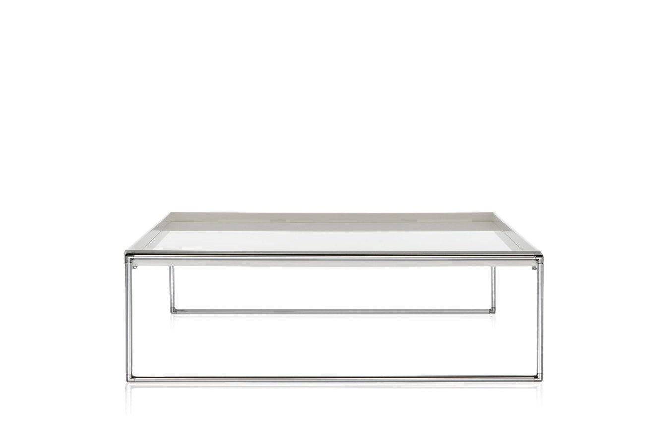 Kartell Trays is een systeem dat onderverdeeld is in tafelbladen voor thuis of op kantoor. Het constructieve idee van het design is de declinatie van tafeltjes en systemen van legplanken waarvan de bladen in hun design en afwerking doen denken aan gelakte Japanse dienbladen. De bladen zijn gemaakt uit sterk, verfijnd methacrylaat en zijn beschikbaar in glanzend zwart en wit. Ze zijn er in drie standaardmaten, ze zijn vastgemaakt aan structuren van verschillende hoogtes, met of zonder wielen. Het volledige design van de collectie verwijst naar het concept van lichtheid en elegantie zonder afbreuk te doen aan stabiliteit en duurzaamheid. De kleine tafeltjes zijn beschikbaar in twee rechthoekige uitvoeringen met een diepte van 40 cm en lengtes van respectievelijk 80 en 140 cm.