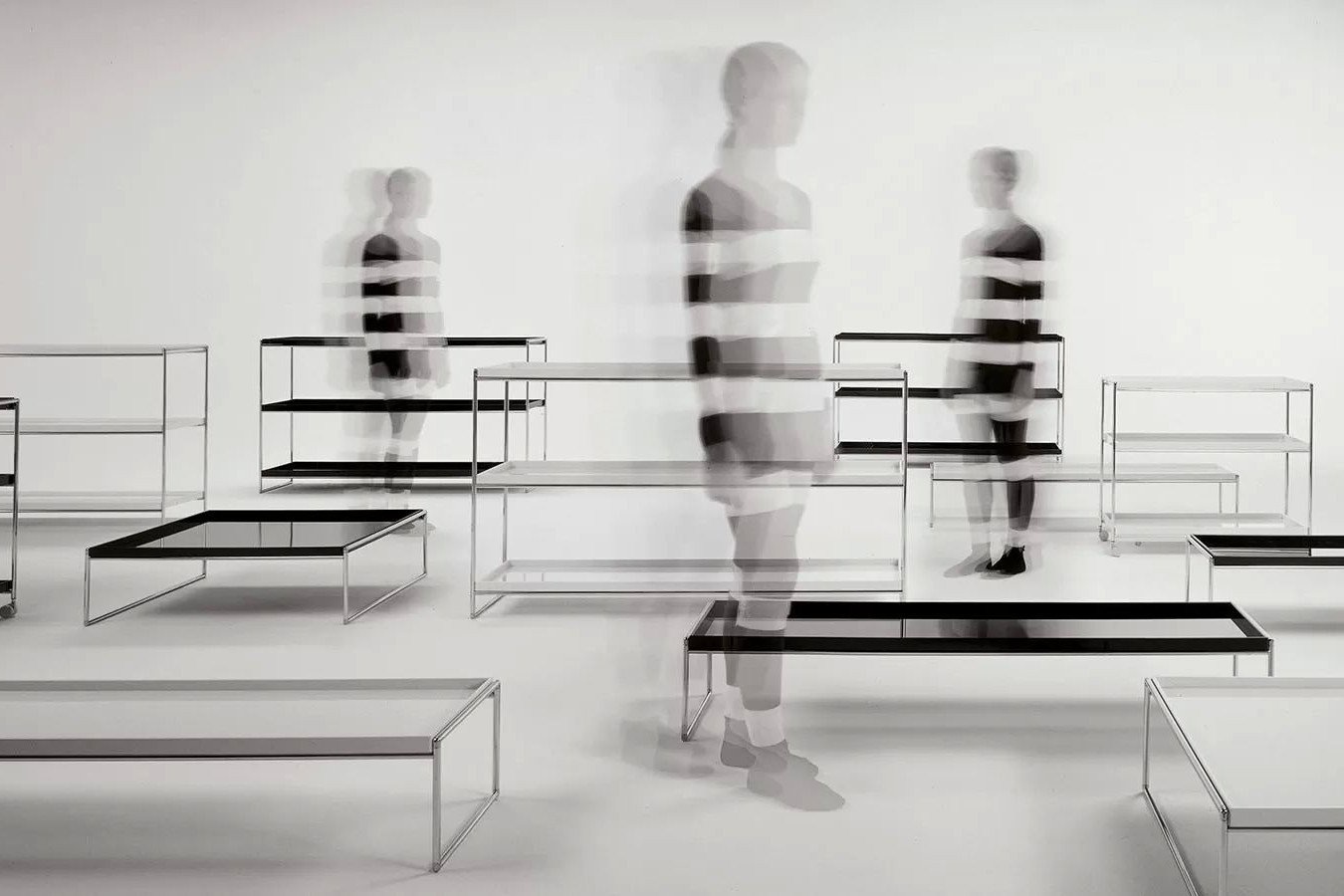 Er is ook een vierkante uitvoering van 80 x 80 cm. De bladen zijn wit of zwart en de ondersteunende structuren zijn van verchroomd staal. Dankzij de mogelijkheid om de metalen structuur weg te halen, dankzij een speciale hoekverbinding om het op zijn plaats te houden, is het verpakte product volledig vlak, waardoor vervoeren en opslaan handiger is. Ook bij het Trays-systeem hoort de trolleyuitvoering op wielen met drie bladen boven elkaar van 80 cm, of van 140 cm als boekenkast.