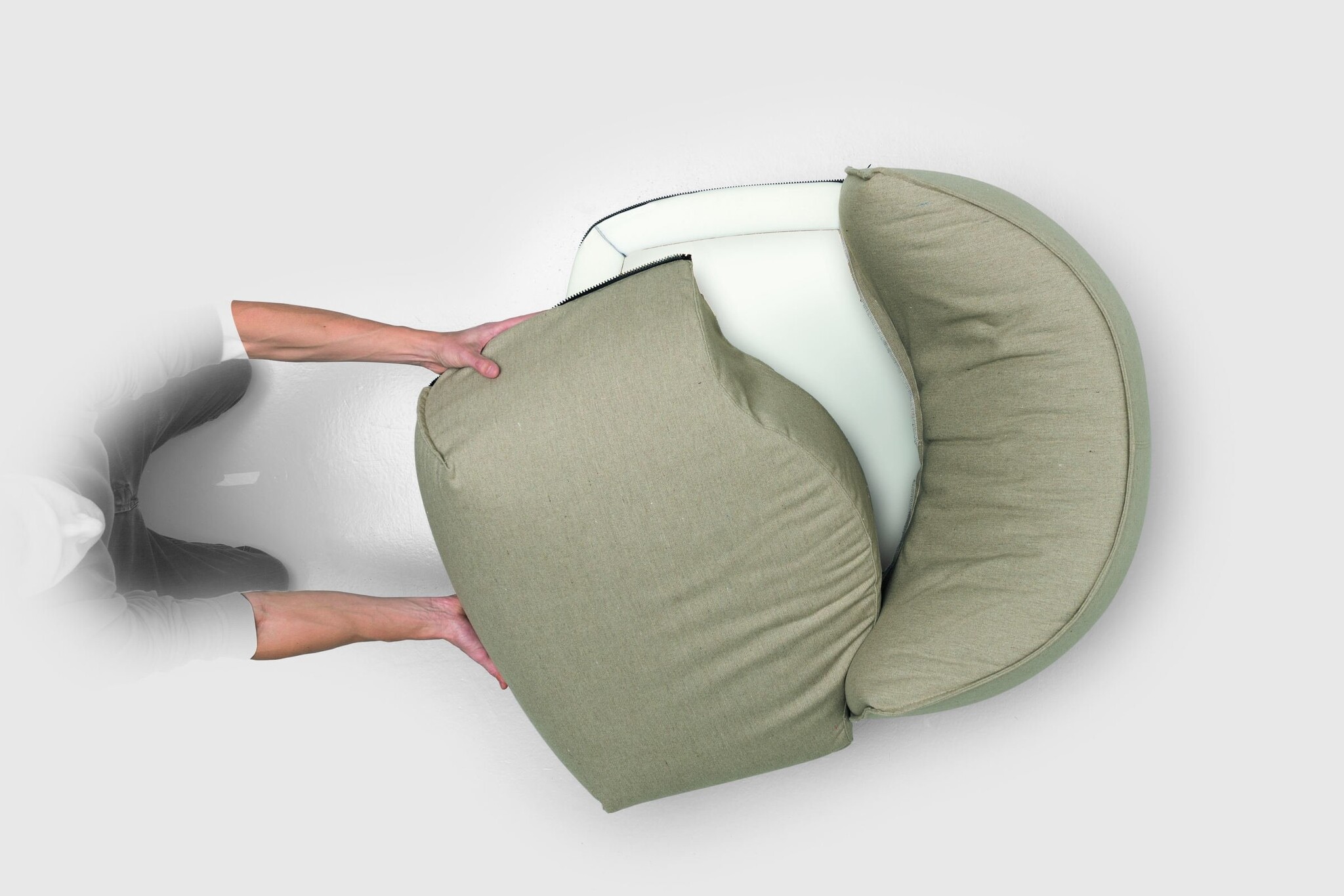 De onderkant van de fauteuil heeft een donkere band die direct contact tussen de grond en de bekleding voorkomt.