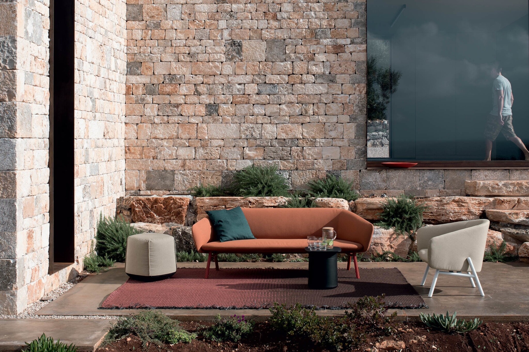 Bekleding voor outdoor: Sunbrella ® stof. Deze acrylstof is ademend, bestand tegen vlekken, UV-licht en waterbestendig en bestaat voor 50% uit gerecycled materiaal.