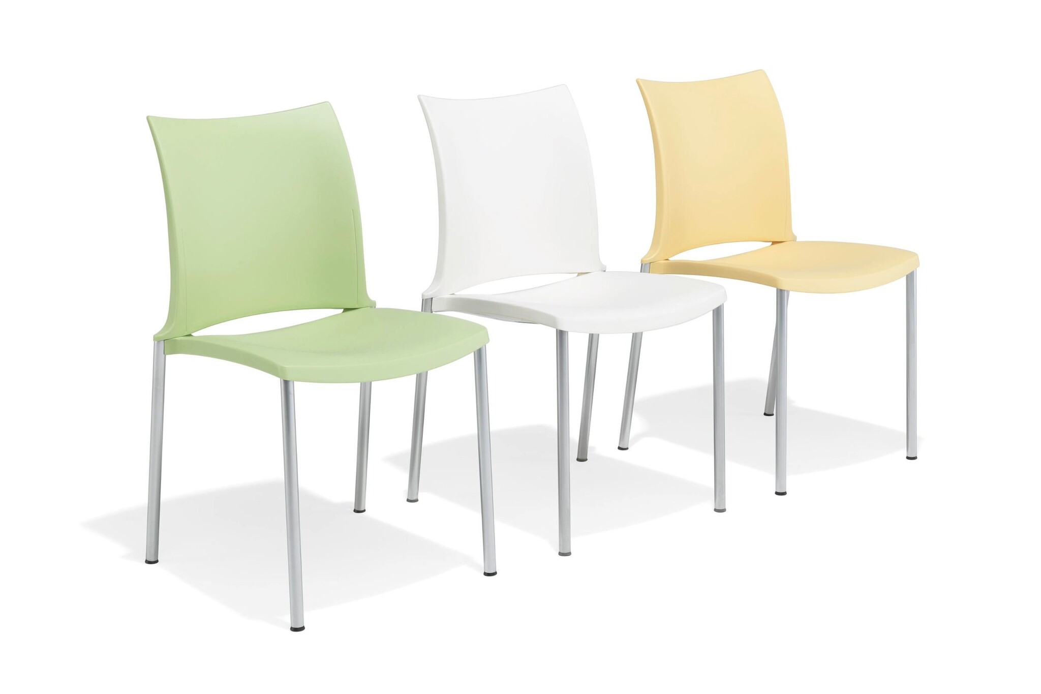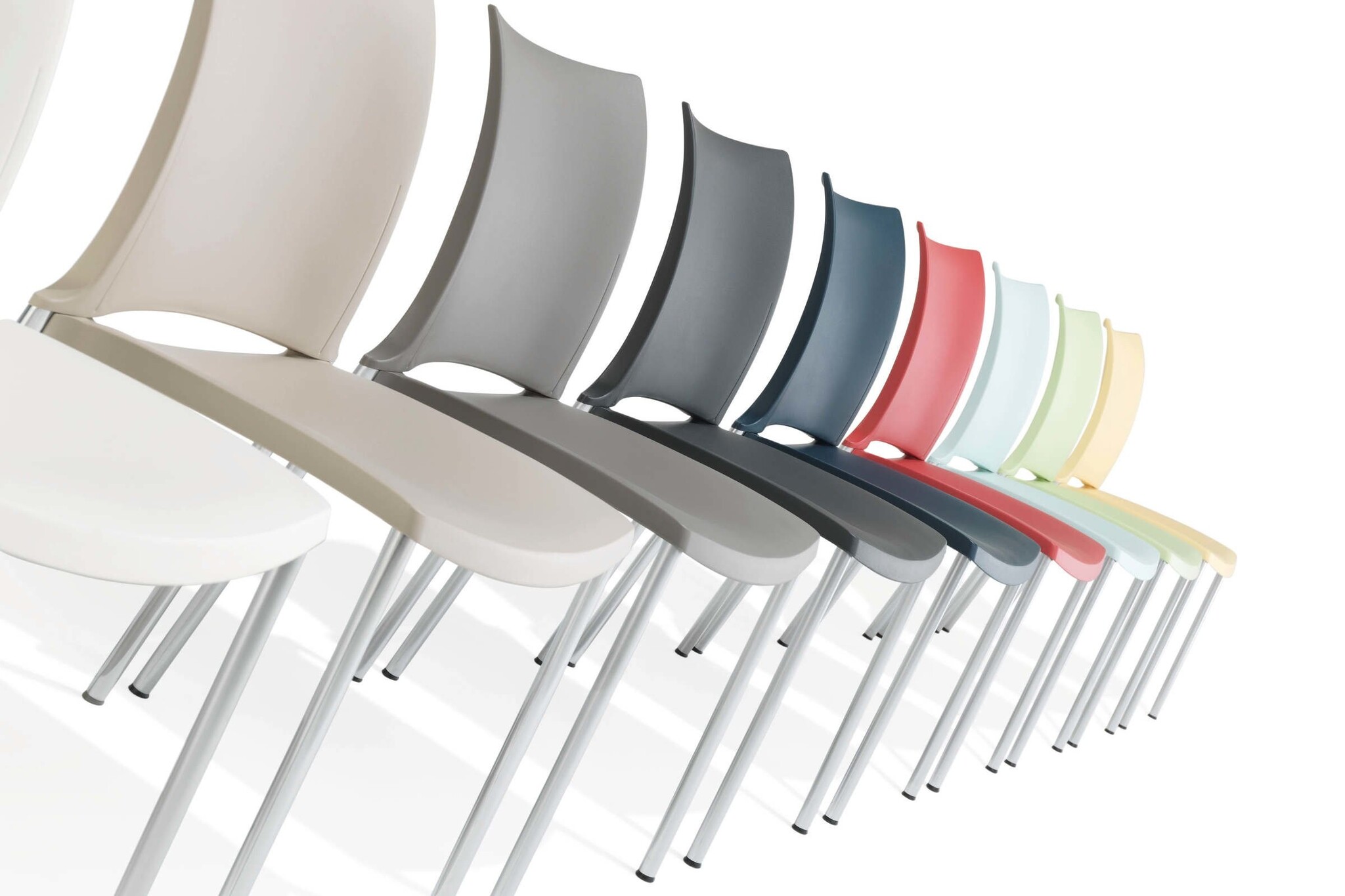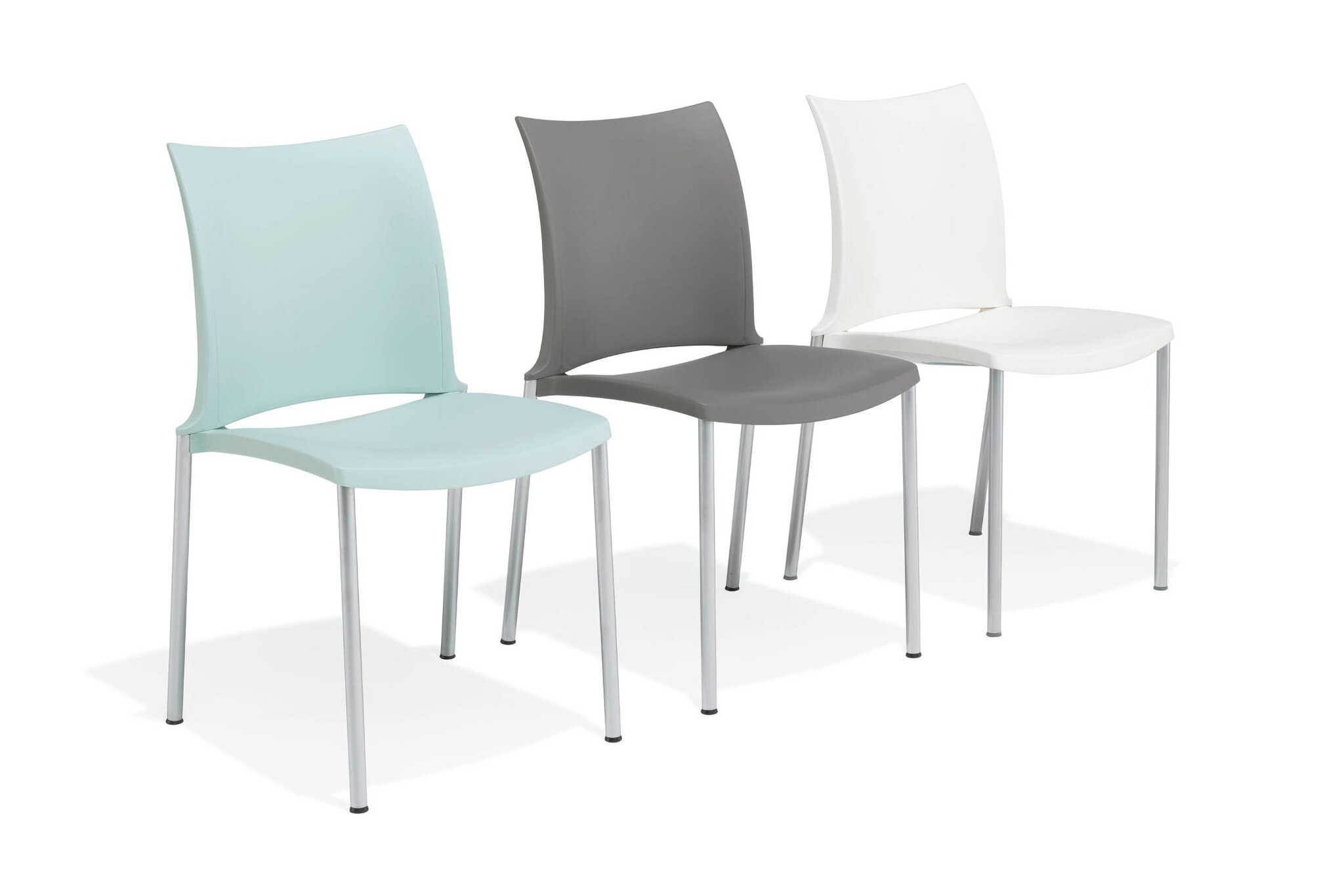 Kusch+Co Hola de allrounder onder de multifunctionele stoelen. Geschikt voor de foyer en de conferentiezaal, maar ook voor vergader- en onderwijsruimtes en casino's, tot zelfs voor grote zalen. Hola van Kusch+Co is eveneens geschikt voor gebruik in openlucht. Grote functionaliteit in een zeer mooie vorm! Hola van Kusch + Co heeft een aluminium onderstel gemoffeld, verchroomd of zijdemat verchroomd.Hola Kusch uitvoeringen: armleggers/zitting/rug kunststof white, lemon, strawberry, lavender, midnight blue, light grey en black (bestemd voor zowel binnen als buiten), tangerine, kiwi en sky blue (enkel voor binnen), kunststofglijder.De kleuren van de moffellak die voor buitengebruik bestemd zijn glanzen niet zo sterk als de normale moffellak.