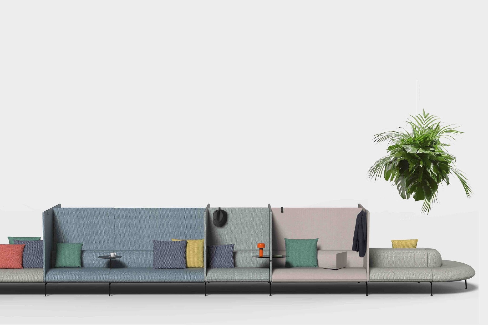De gevoerde panelen, die eenvoudig te verwijderen of te verplaatsen zijn, creëren zo eenvoudig een werkruimte op de bank. In combinatie met de diverse accessoires, zoals tafels, USB-elektrische aansluitingen en jashaken verandert u zo de Couchette in extreem stille tijdelijke werkplekken.