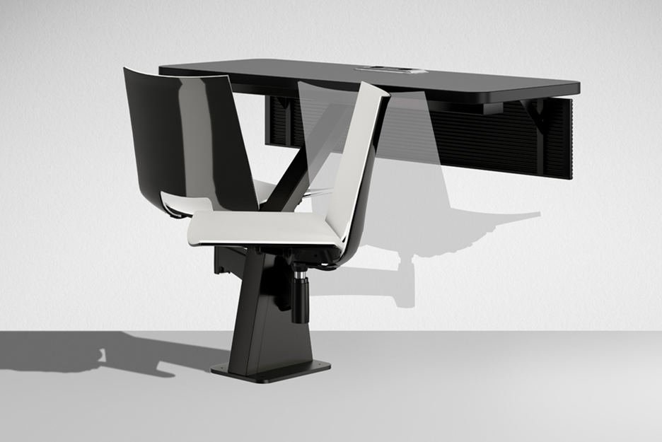 De buis in het midden van het bureau zorgt ervoor dat de ST12-13 stoelen met elkaar verbonden blijven, maar maakt het ook mogelijk om de hele Lamm ST12-13 plek te monteren aan de vloer.