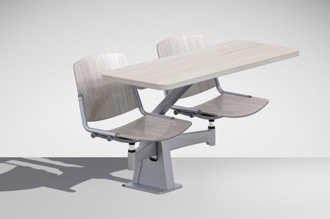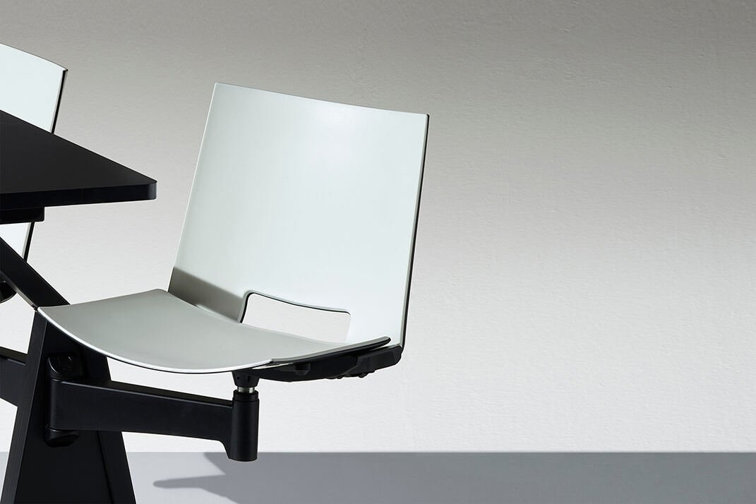 De stoel zit vast aan de tafel. Iedere werkplek is dan ook volledig voorzien van een stoel en een tafel waaraan gewerkt kan worden.