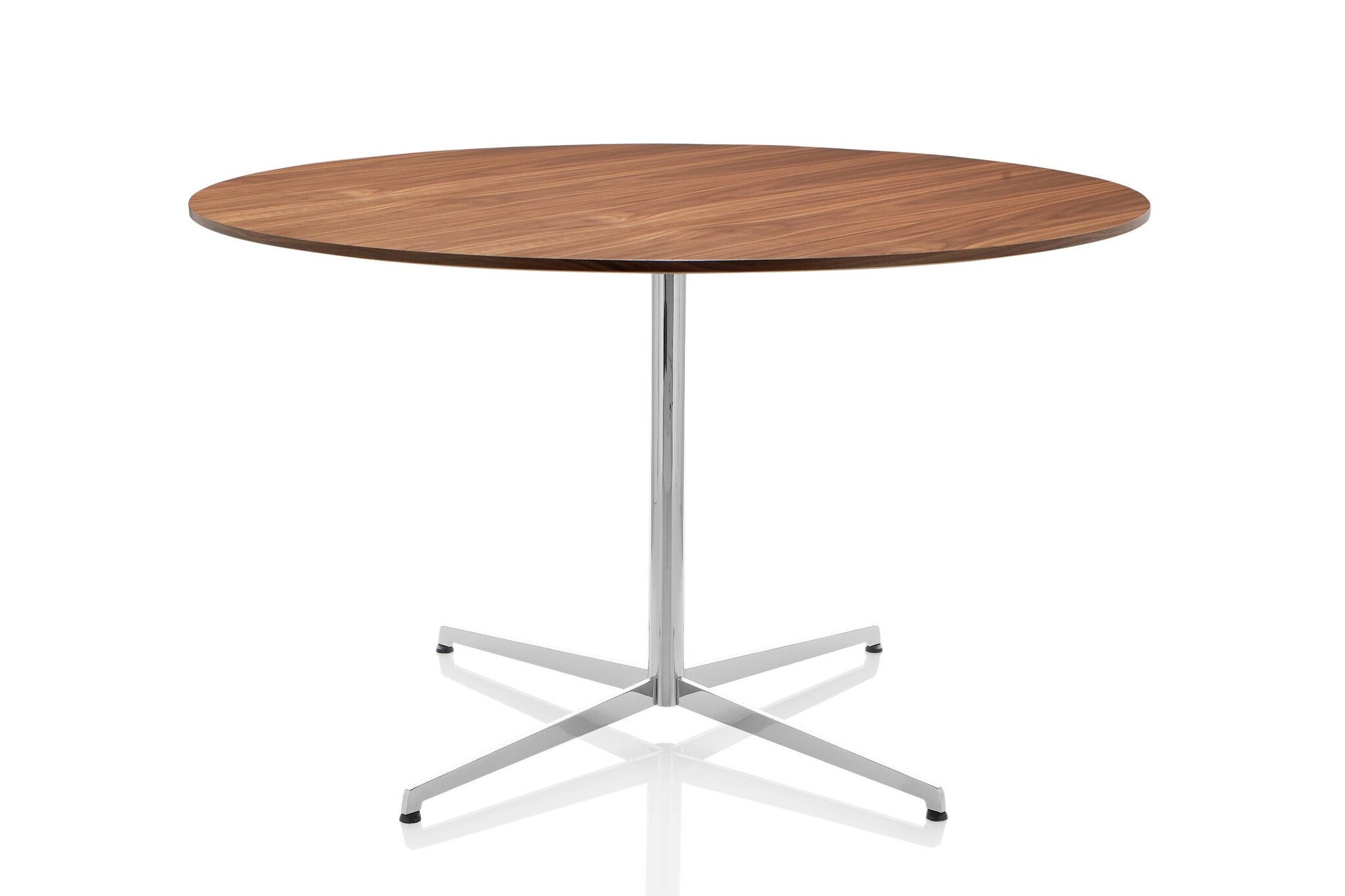 Lammhults Cooper Table heeft een tafelblad van 10/12 mm wit compact laminaat of 16 mm MDF met walnoot fineer en randen in walnoot. Onderstel uit verchroomd of poedercoated staal.