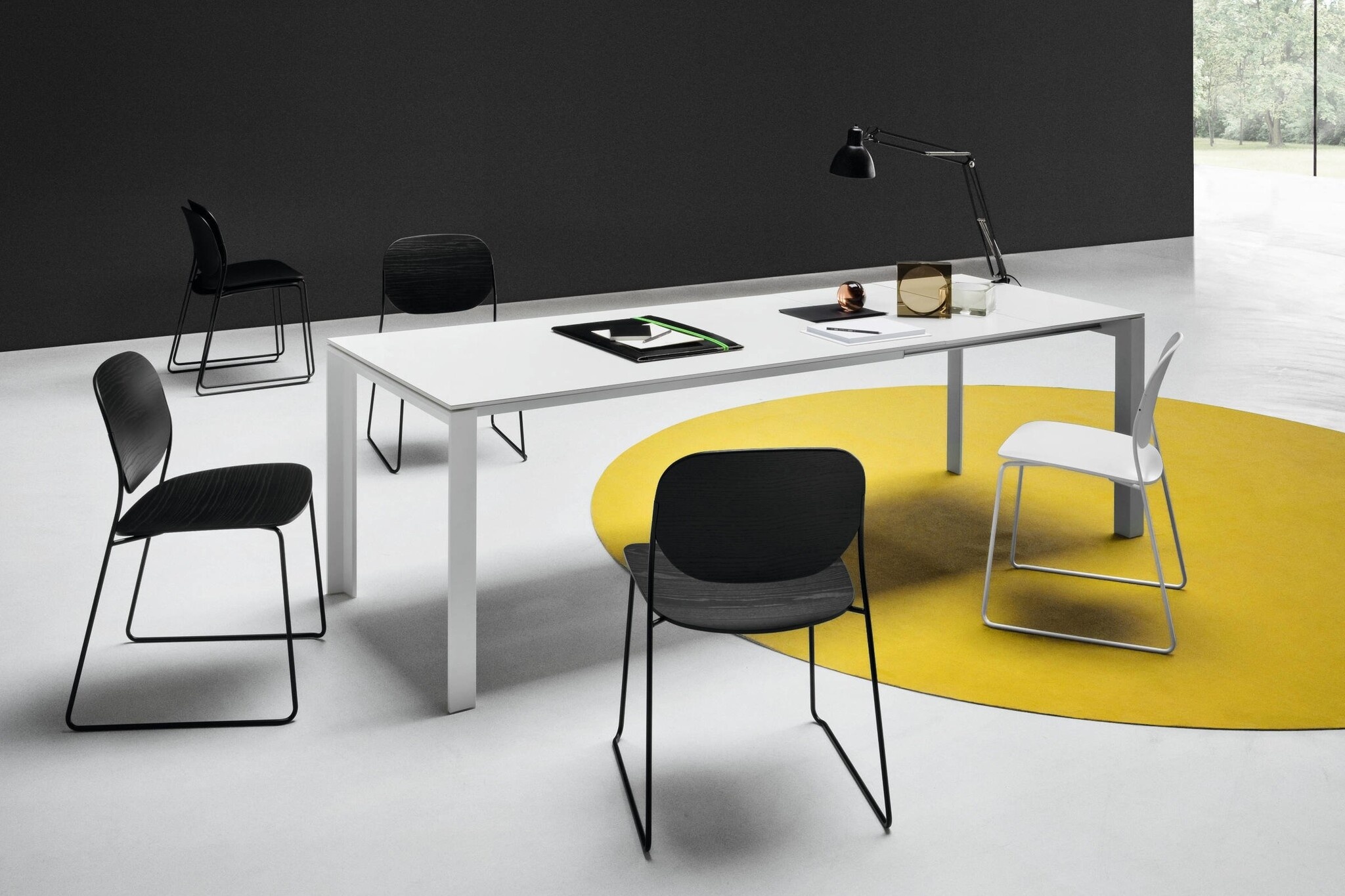 Een uitschuifbare tafel met frame in gelakt aluminium. Apta is voorzien van een tafelblad uitgevoerd in honingraat aluminium, welke ook kan worden geleverd in gelamineerd of walnoot Canaletto. Apta is tevens verkrijgbaar met een vast tafelblad. Deze kan in beton- of gehard glas, in de kleuren wit of donkergrijs worden uitgevoerd. De tafel heeft een lichte, moderne uitstraling en is toepasbaar in vele diverse ruimtes, zoals op kantoor en in huis. Lapalma Apta kan verder indien nodig, worden verlengd.Over Lapalma