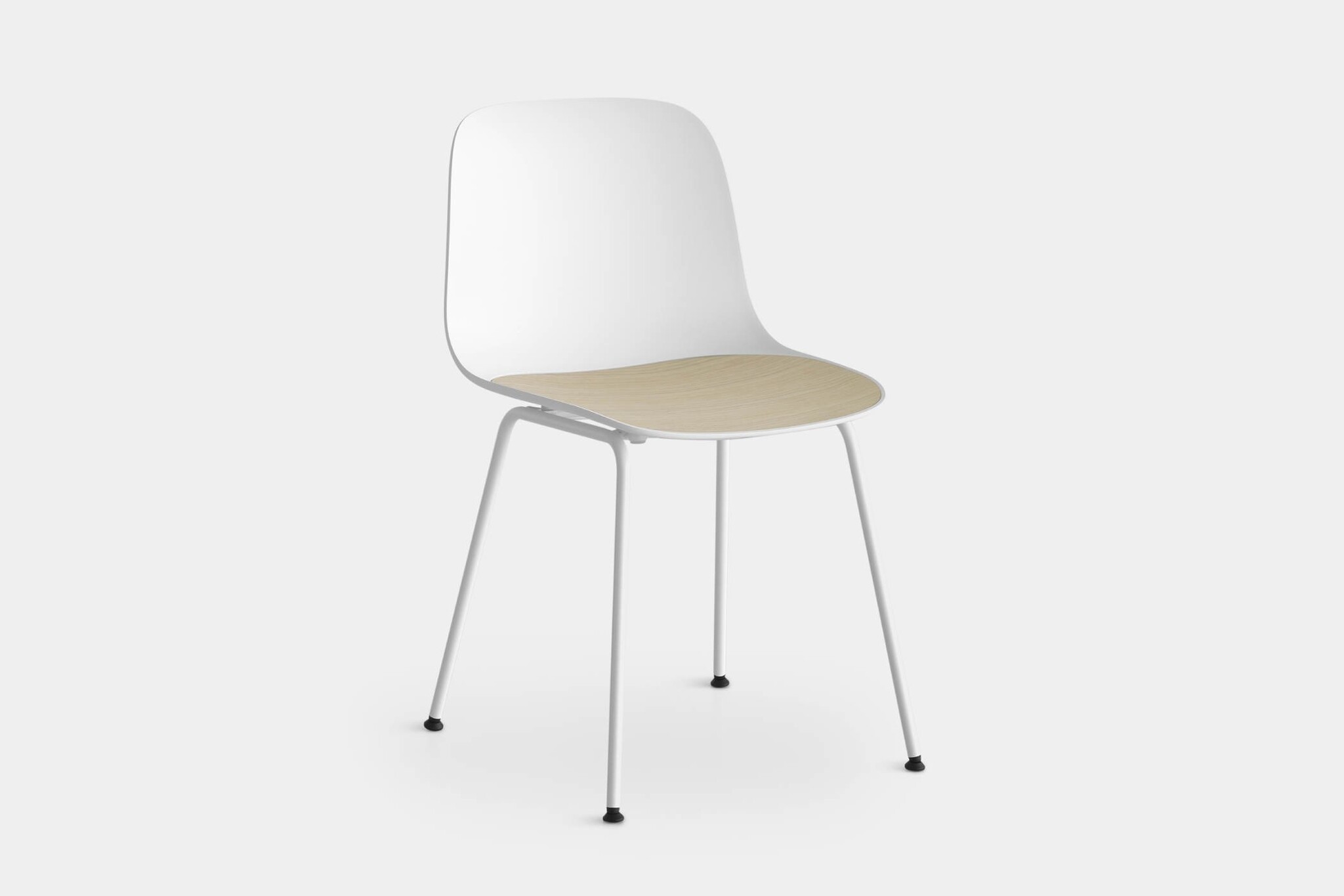 De stoelen hebben een zitschaal in polypropyleen en geïntegreerde naadloze zitting in polypropyleen met bekleding aan de voorzijde of volledig gestoffeerd in de stoffen Jet, Medley of Tonica.