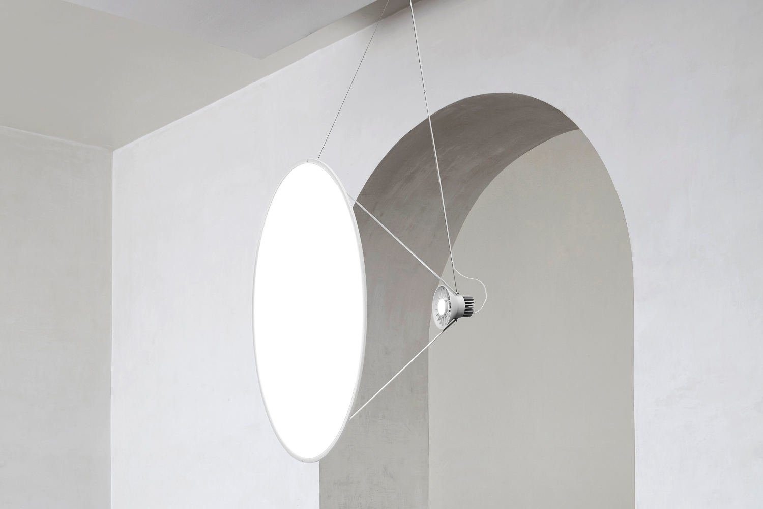 De Amisol collectie van Luceplan is een ruimtelijke lamp met een indirecte werking. Er zit een spot die krachtige LED verlichting geeft achter een gespannen folie. Deze folie kan doorschijnend of gemetalliseerd zijn. Deze twee elementen worden verbonden door dunne staven van aluminium. Kenmerken Luceplan Amisol hanglamp | verlichting