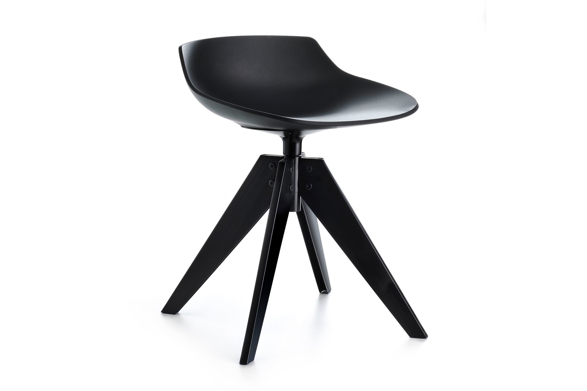4 poten base staal, metaal, geschilderd mat wit of grafiet, met aluminium koppelinrichting in dezelfde kleur, 360 graden draaibaar. Stoelhoogte beschikbaar in: 44, 65 en 78 cm.